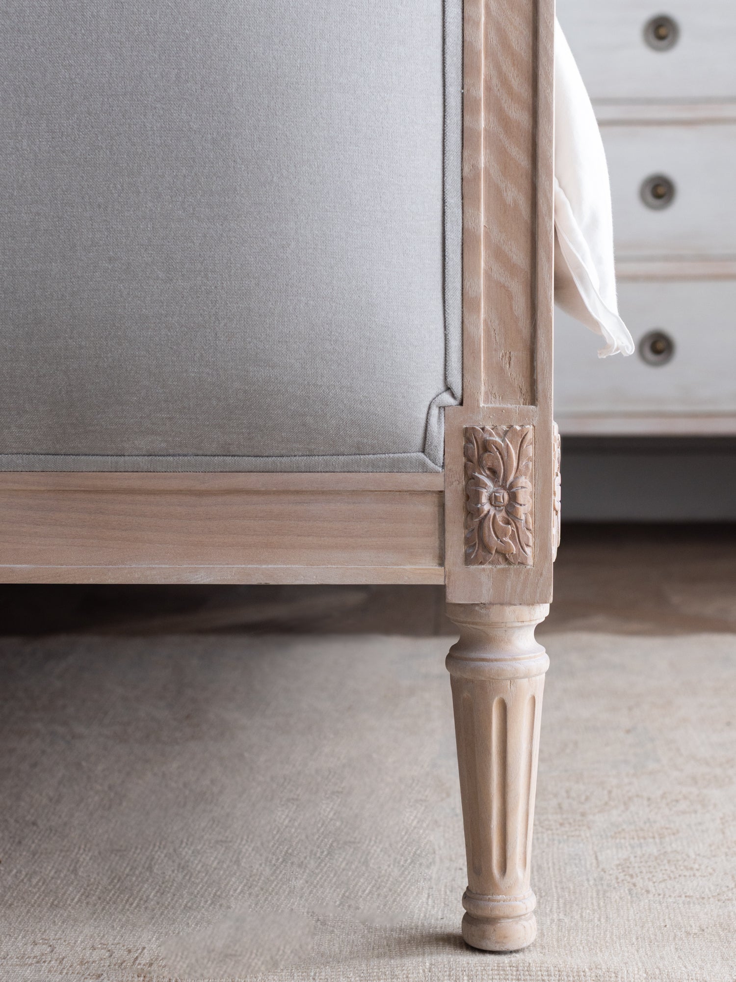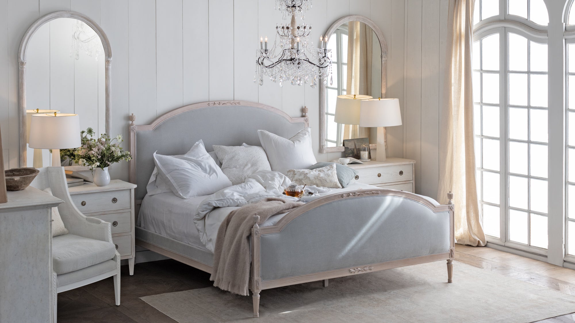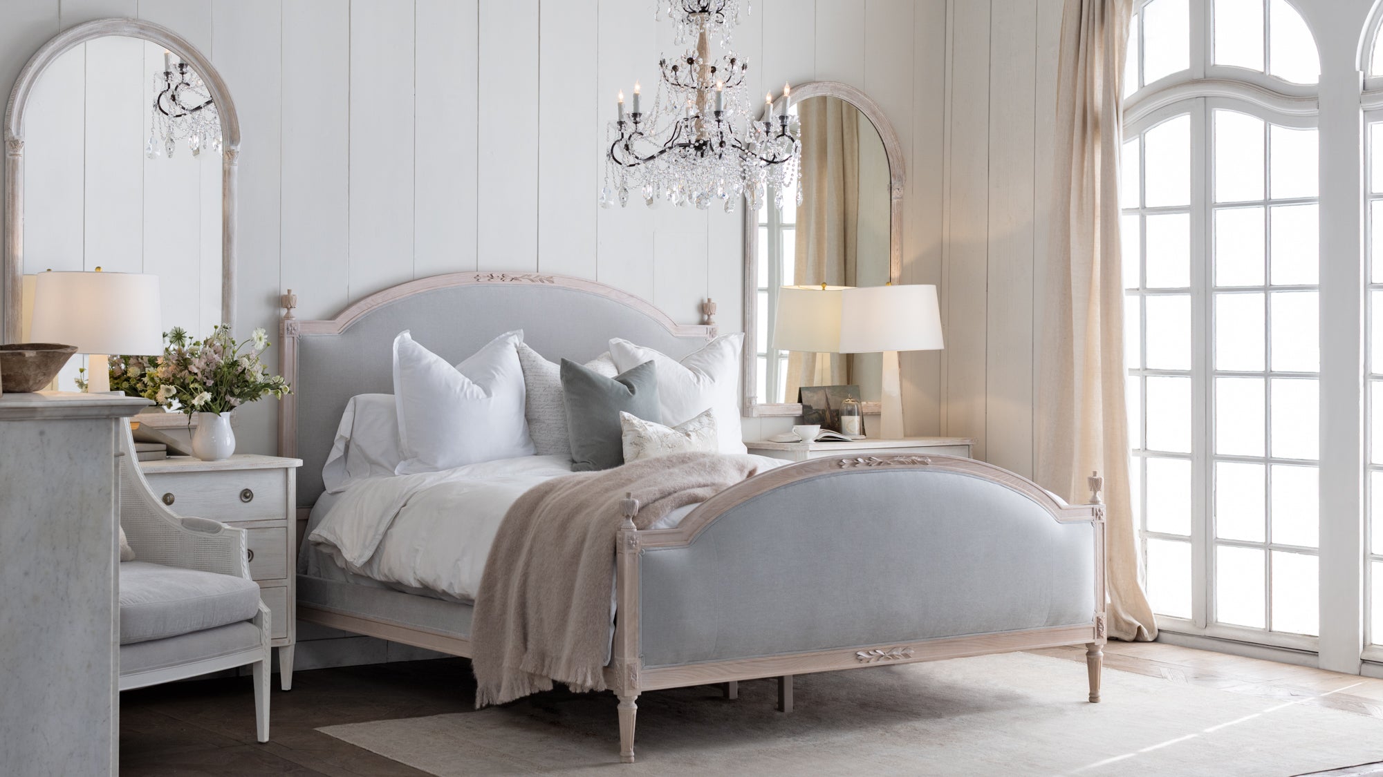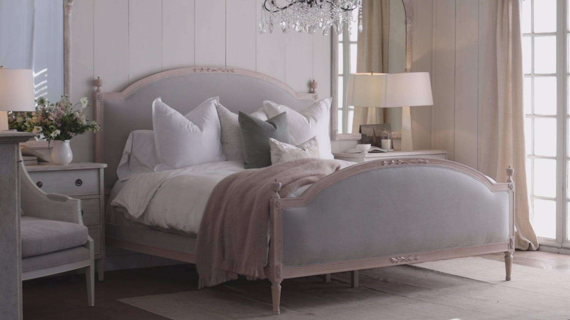 Dauphine Bed in French Eggshell Chenille and Pale Ashwood Finish