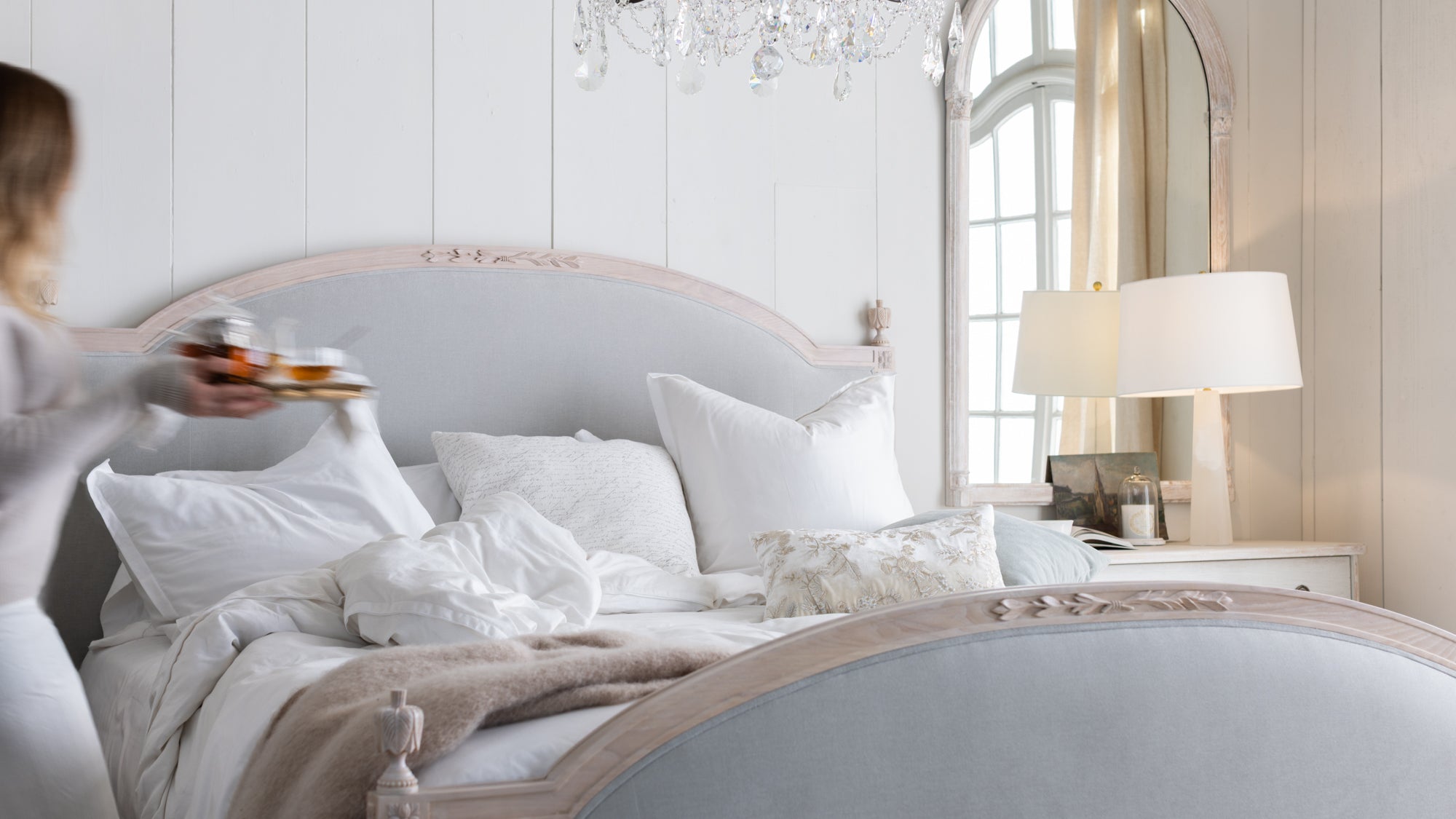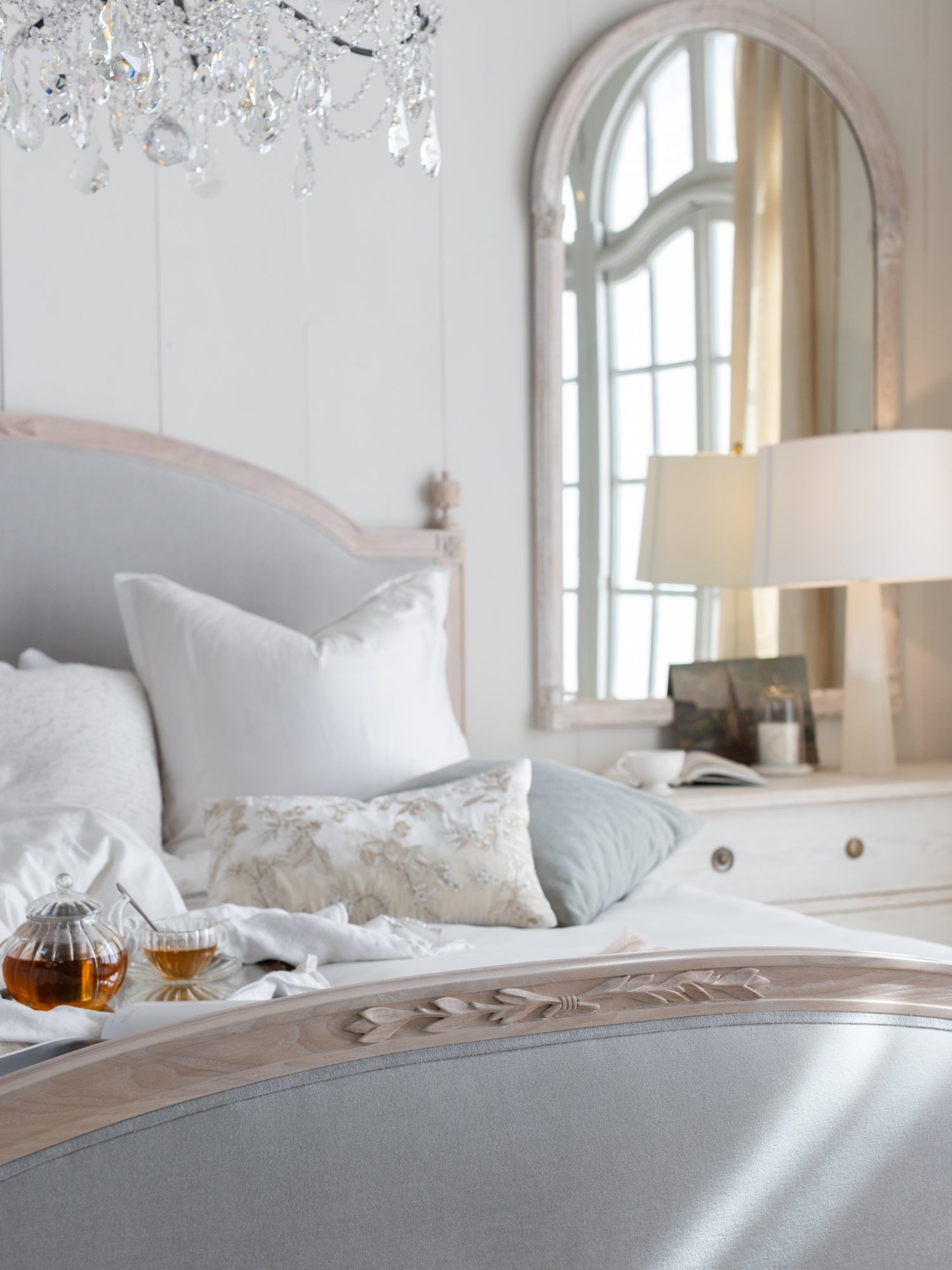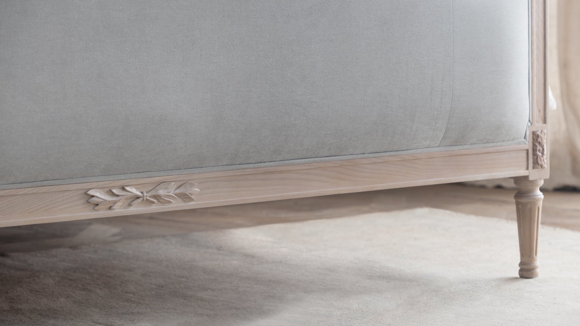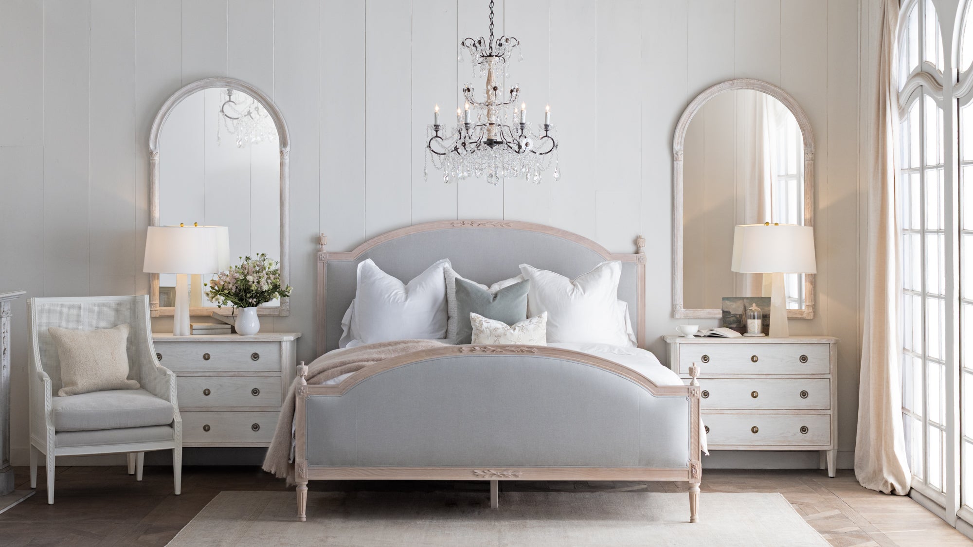Dauphine Bed in French Eggshell Chenille and Pale Ashwood Finish