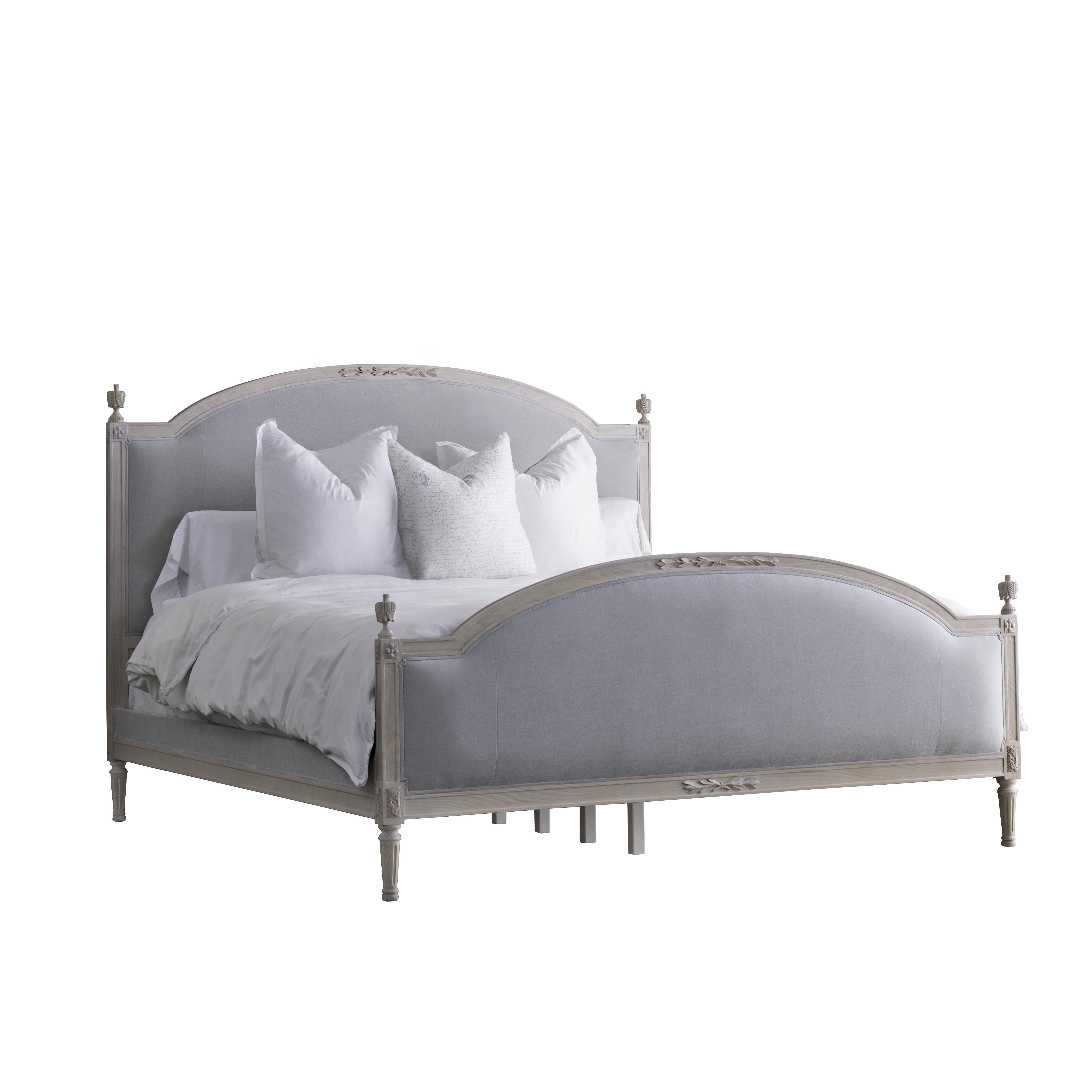 The Eloquence® Dauphine Bed is a statement piece. This sleek and elegantly crafted Louis XVI style bed will bring serenity to your slumber. Eloquent hand carvings depicting olive leaves tied with twine adorn the headboard and footboard crest. The French style bed frame is constructed in Ash Wood and Acacia Wood.