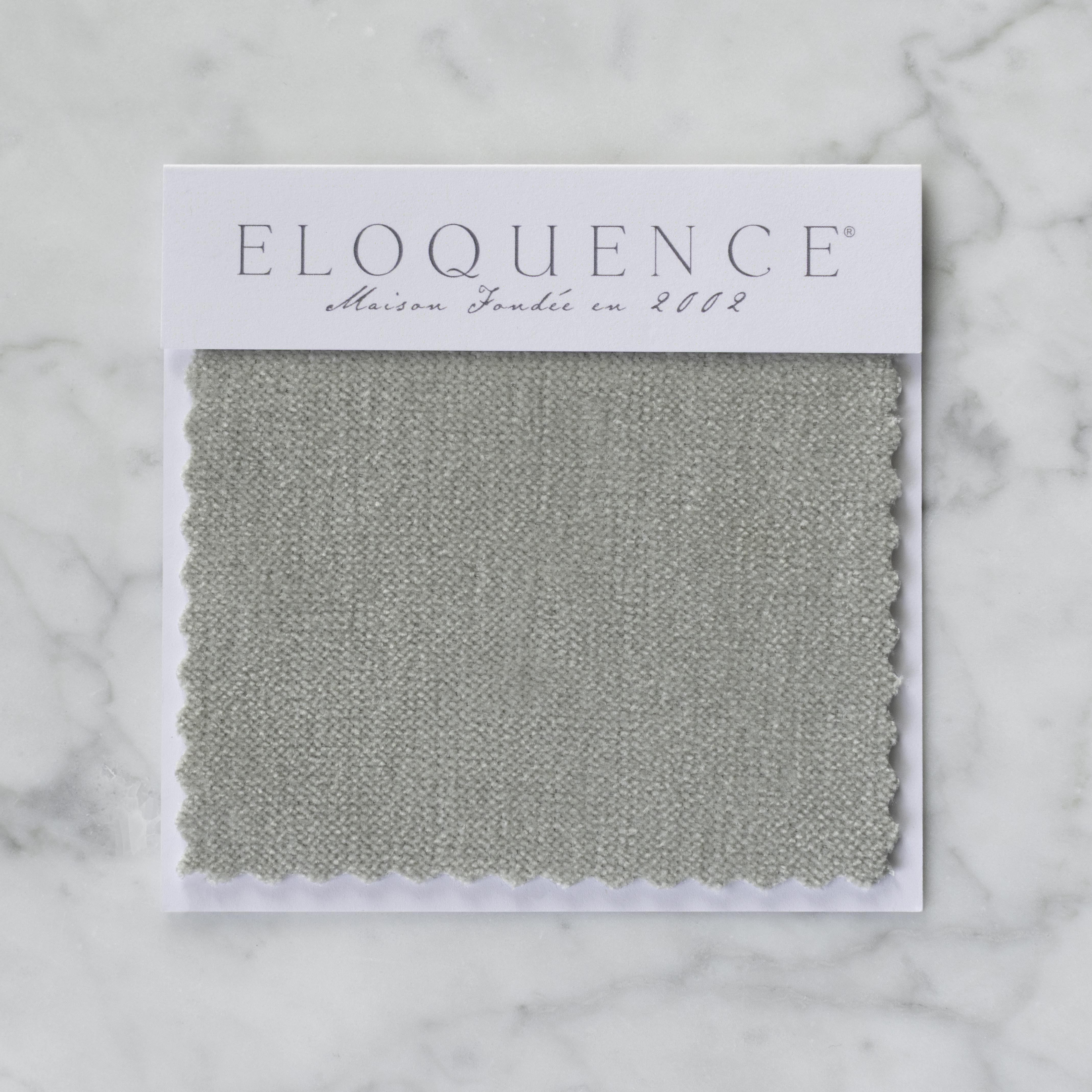 The Eloquence® French Eggshell Chenille is a brushed fabric in a warm duck egg shade of grey with a soft sheen in the light. The grey tones and soft texture make this an opulent material in both look and feel. Depending on the wood frame color, it can read more duck egg blue on a warm-toned background and a more green-grey on a cool-toned background. See pictures for more. To shop the French Eggshell Sample, please click HERE.