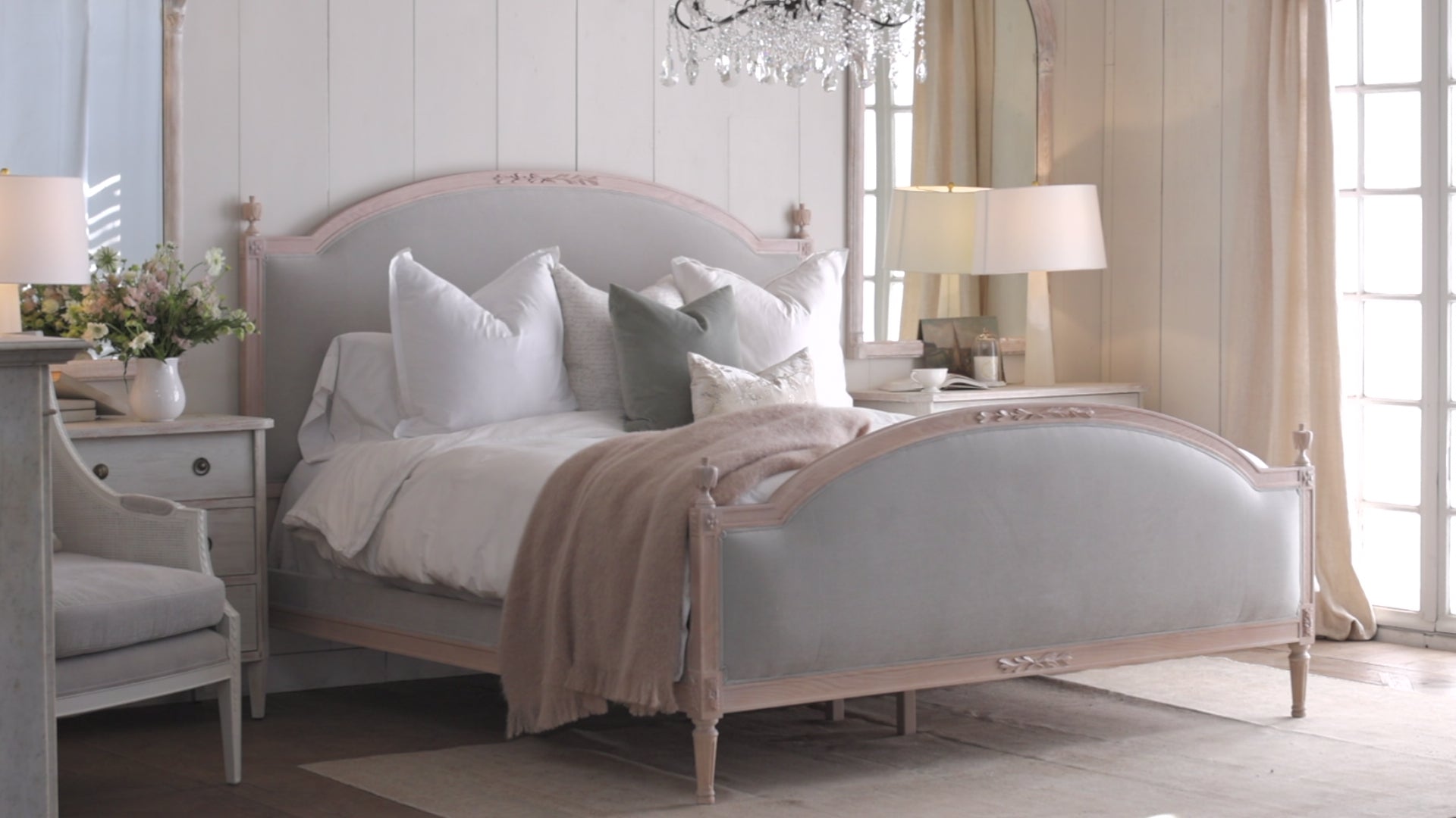 Dauphine Bed in French Eggshell Chenille and Pale Ashwood Finish