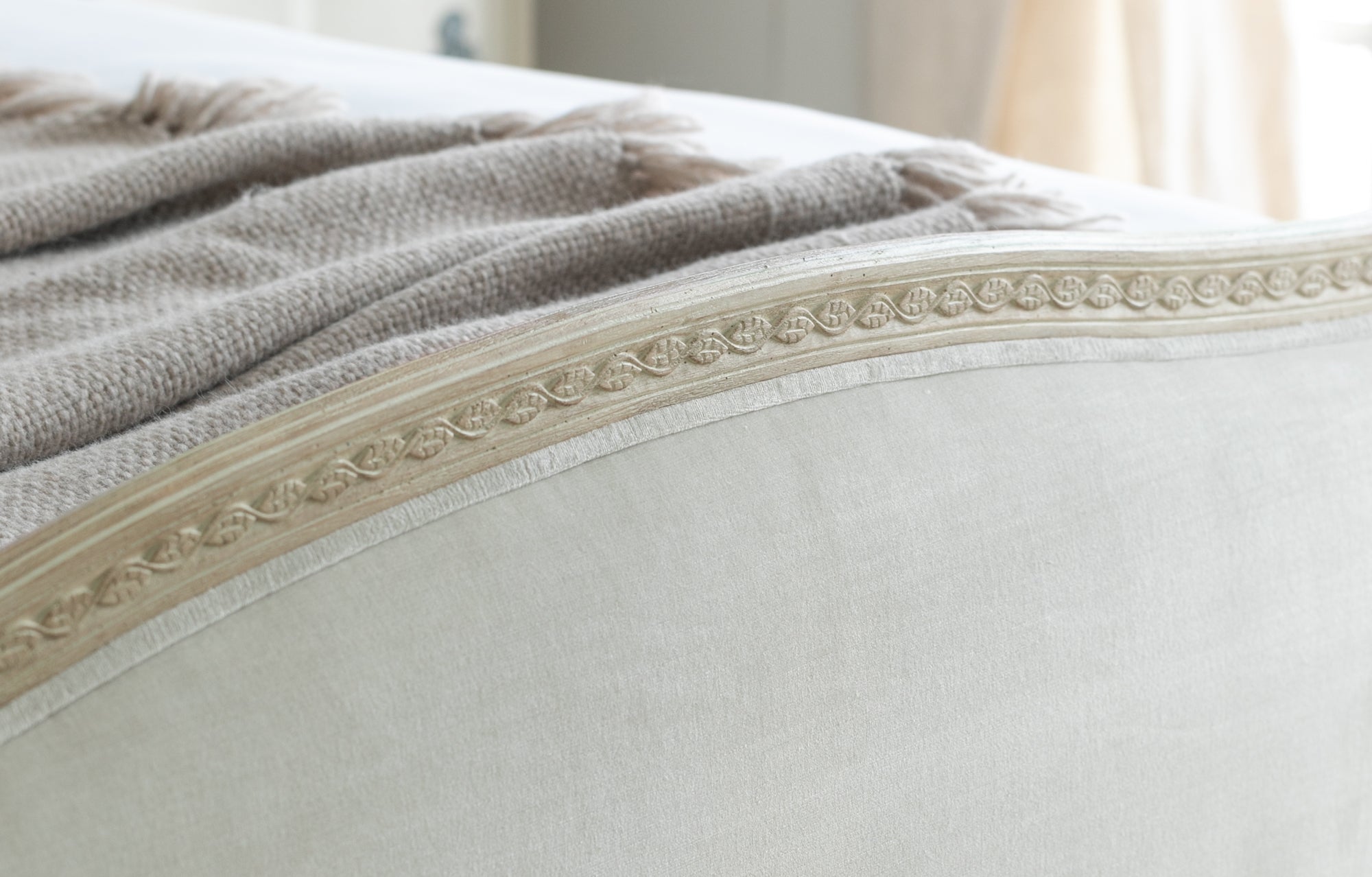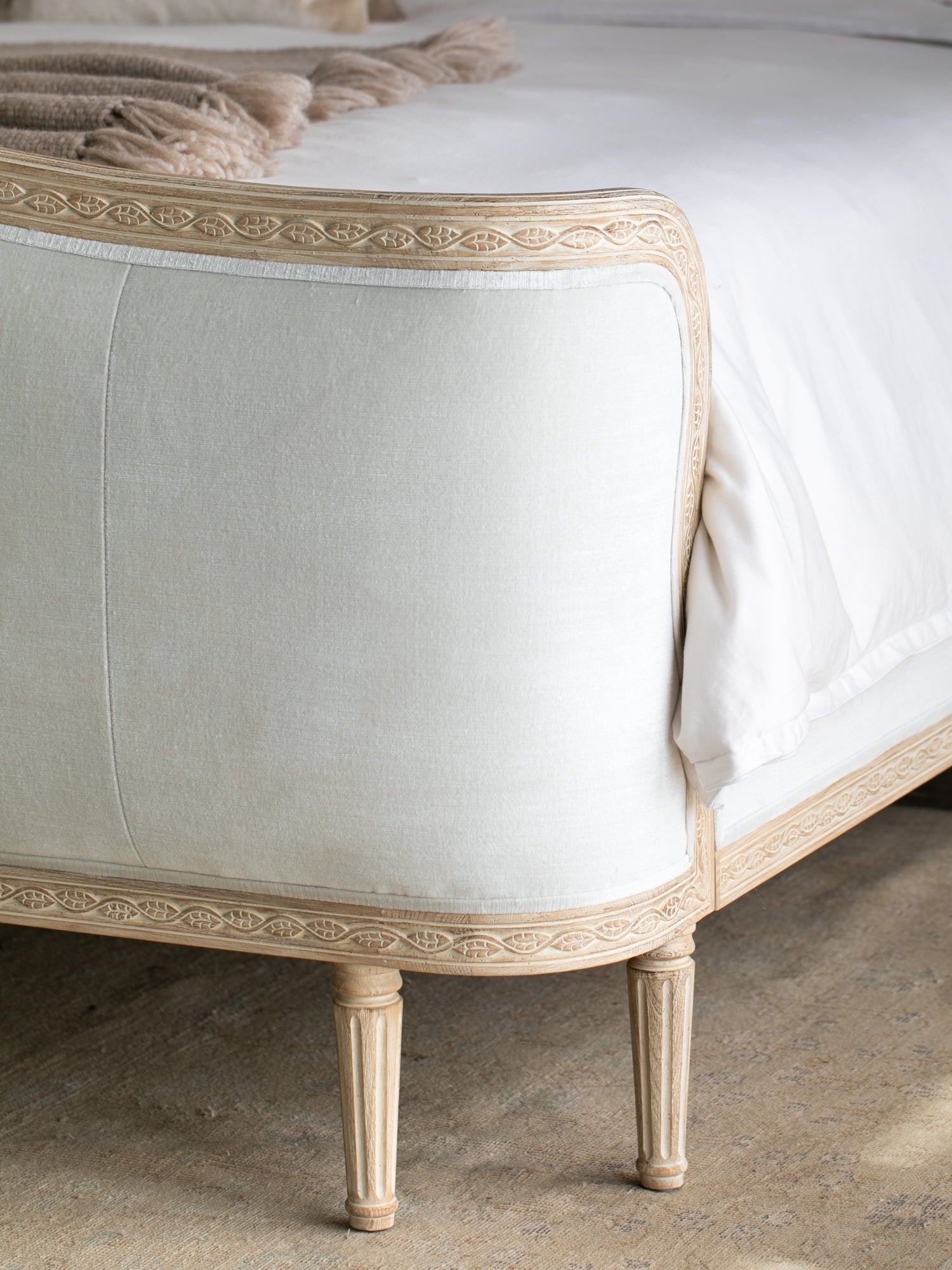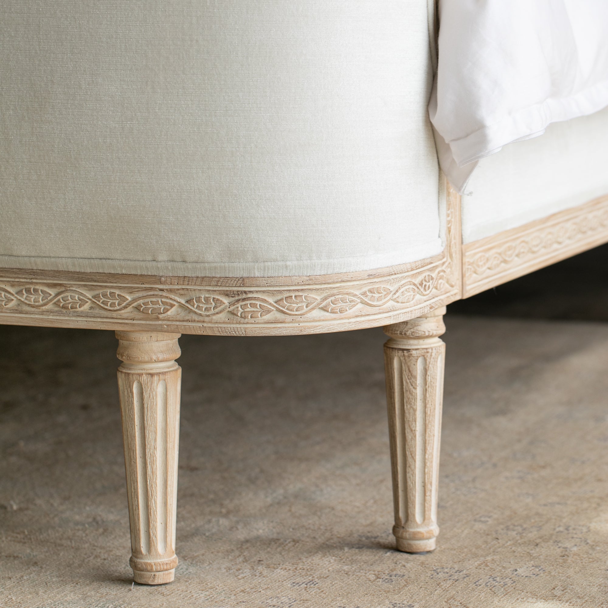 The Eloquence® Helena Bed is a fresh and exclusive new design. It has a profoundly romantic and restful character with it’s enveloping and sculptural shape. The gracefully fine curves of this piece create a cocoon-like feeling of luxury. Helena is inspired by a French antique bed which we fused with the restrained influence of Scandinavian craftsmanship. Delicate hand-carved Swedish leaf carvings seamlessly blend with the refined Louis XVI French style fluted legs for a modern edited feel that will charm without over-embellishment. The Helena Bed is upholstered in a thick, luxurious, striated velvet which adds even more serene beauty and charm.