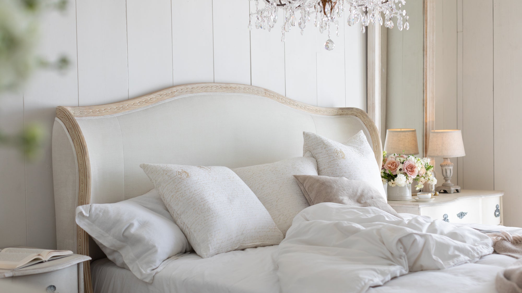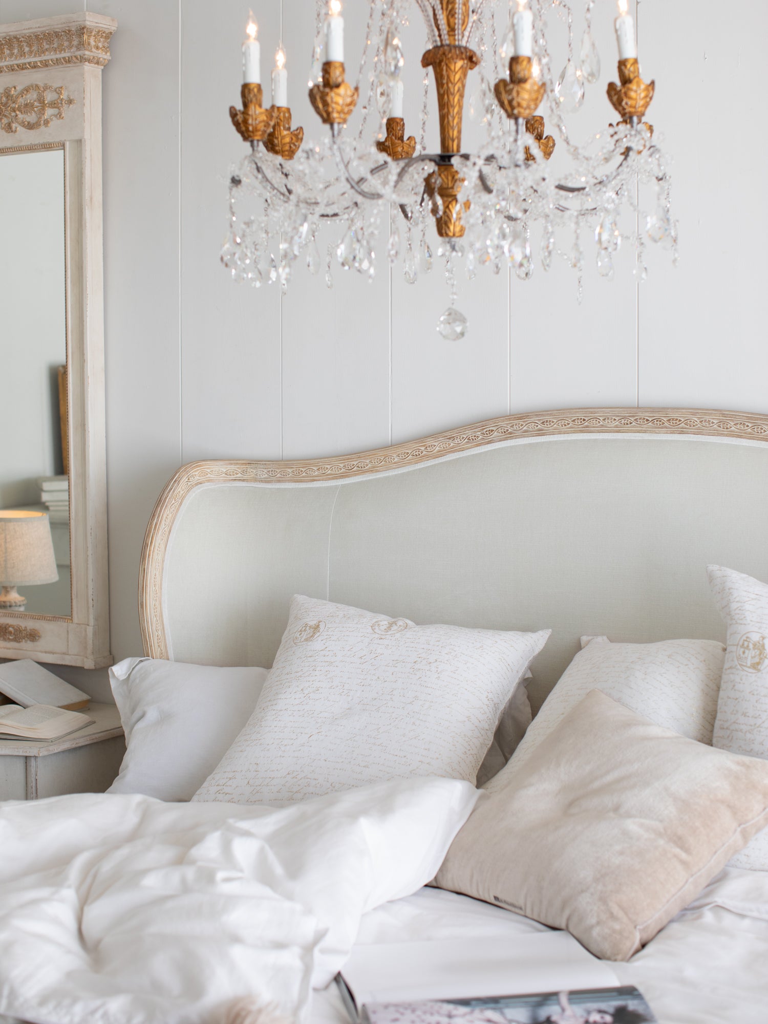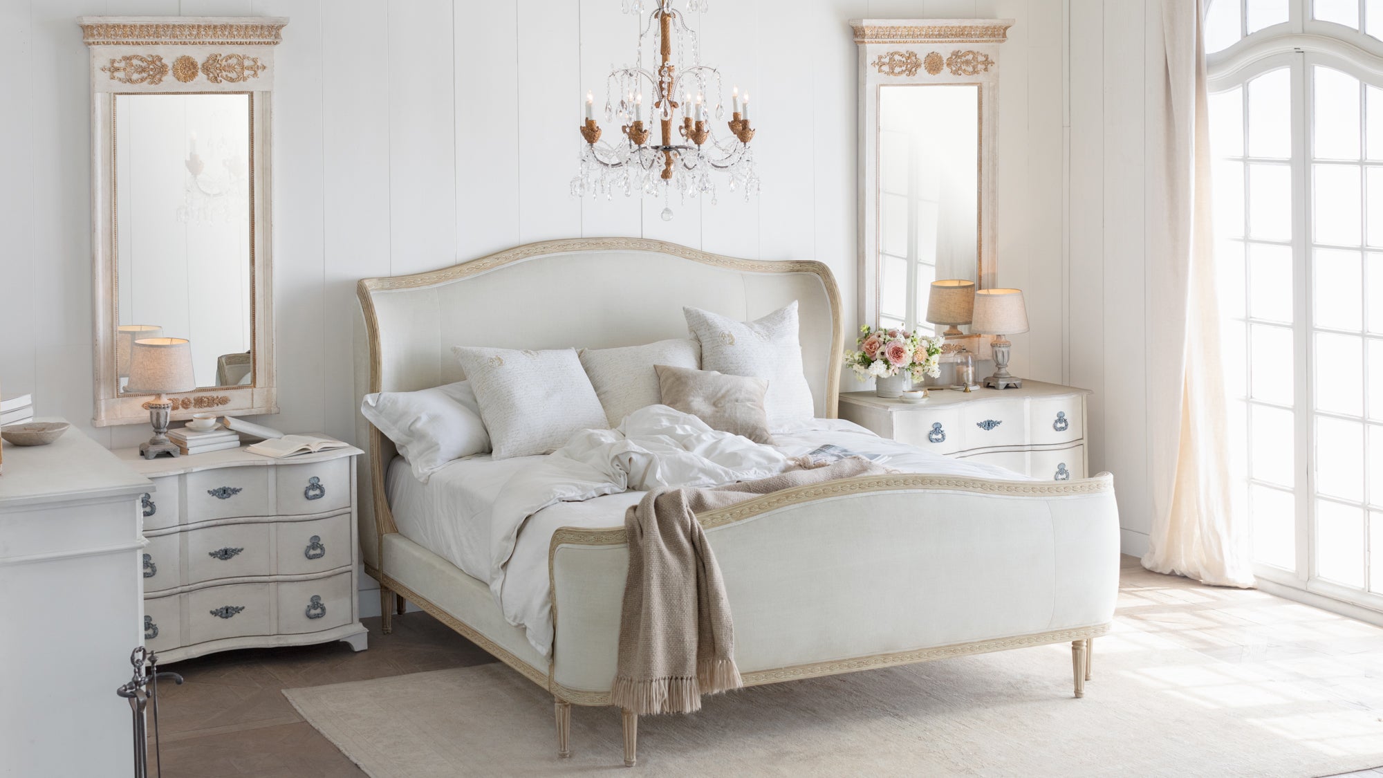 The Eloquence® Helena Bed is a fresh and exclusive new design. It has a profoundly romantic and restful character with it’s enveloping and sculptural shape. The gracefully fine curves of this piece create a cocoon-like feeling of luxury. Helena is inspired by a French antique bed which we fused with the restrained influence of Scandinavian craftsmanship. Delicate hand-carved Swedish leaf carvings seamlessly blend with the refined Louis XVI French style fluted legs for a modern edited feel that will charm without over-embellishment. The Helena Bed is upholstered in a thick, luxurious, striated velvet which adds even more serene beauty and charm.