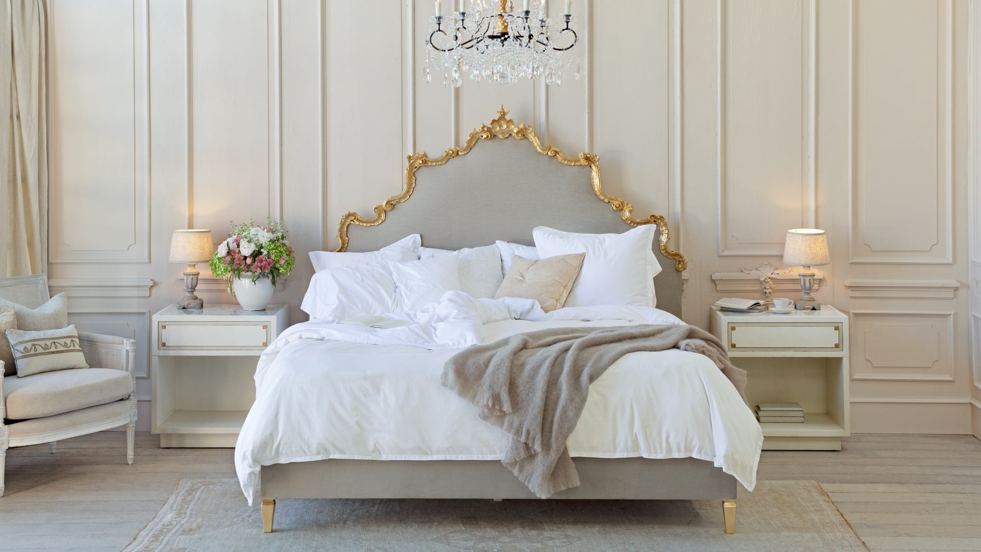 The Eloquence® Froth White and Gold Highlight Finish captures the sophistication of French architectural boiserie wall panels from the 18th century. Soft, grey hues at the insets and gilded highlights on the front panel mark the finishing touches to this soft, off-white artisanal finish.