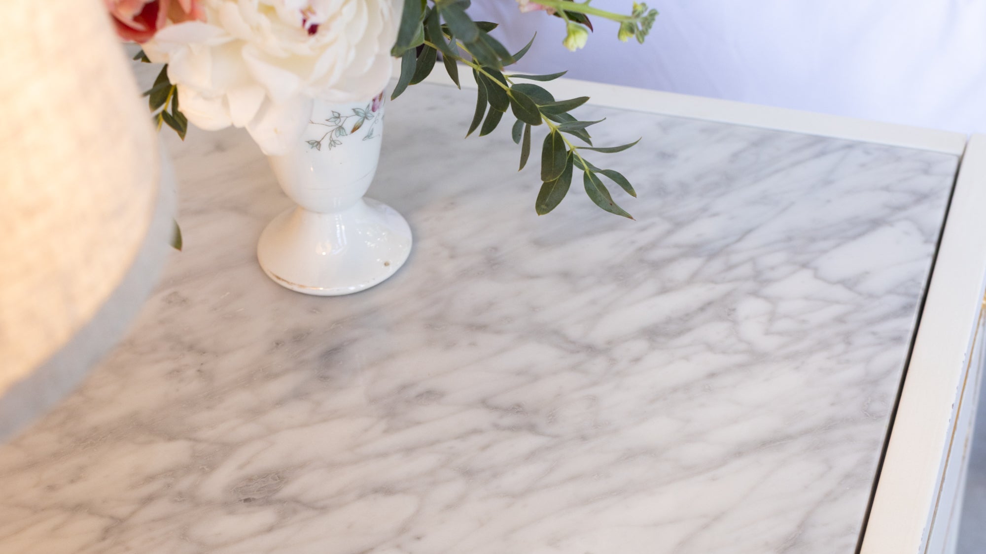 The Eloquence® Henri Nightstand is an elegant French-inspired bedroom piece. Its Parisian sensibilities are defined by its ornate gilt trim and inlaid Carrara marble top, blending traditional detail with modern simplicity. A flush-front drawer, open display storage, and airy white finish, perfect this chic nightstand tailored for timeless interiors.