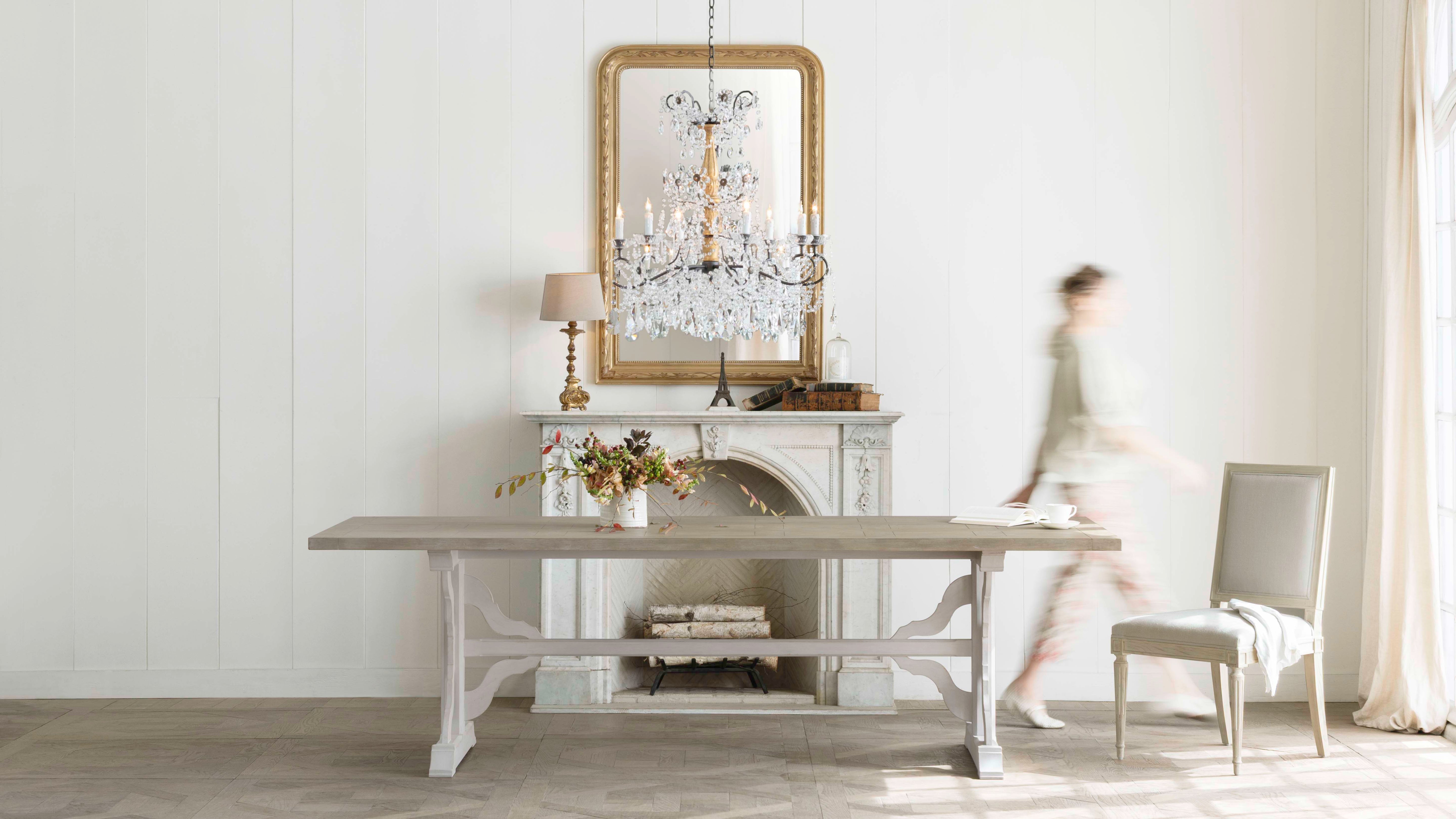 The Eloquence® Grande Thoreau Dining Table is the perfect centerpiece for conversation. Its artfully sculptured base and washed wood top set a warm and inviting scene for family and friends to gather around. This is a beautifully crafted piece that will age gracefully with wear and use. Includes 2 extensions that drop in seamlessly for larger gatherings.