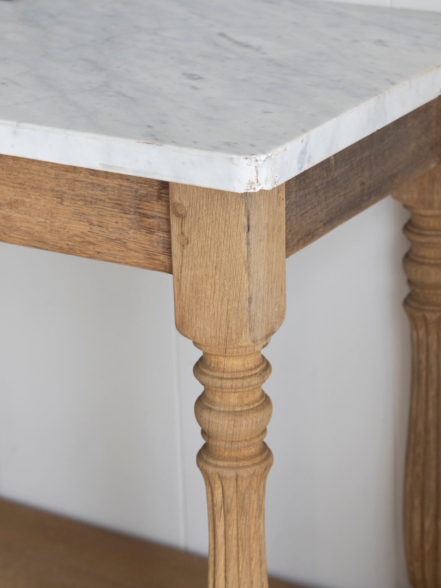 Charming antique drapery table with fluted ball and reel legs, arrow feet, and a polished Carrara marble top. The piece is in great condition with very little wear, only some light markings on the marble. Perfect as a console table or in an entryway.