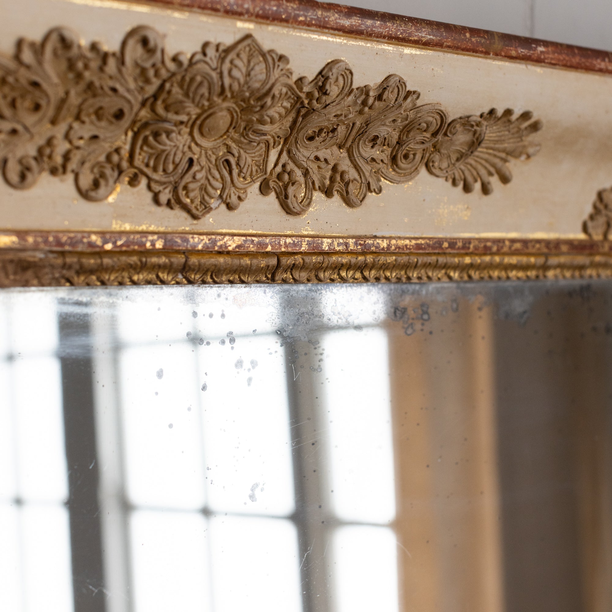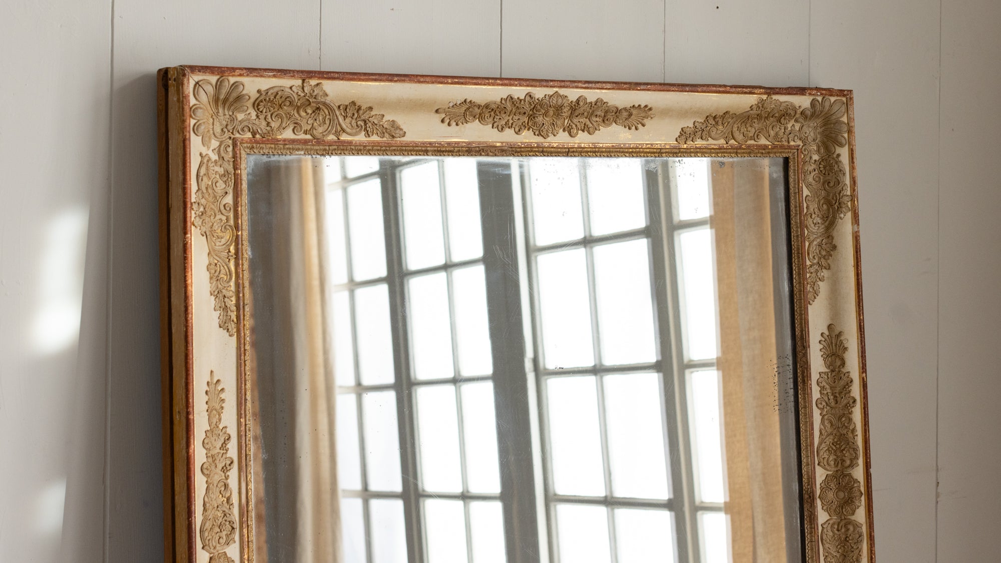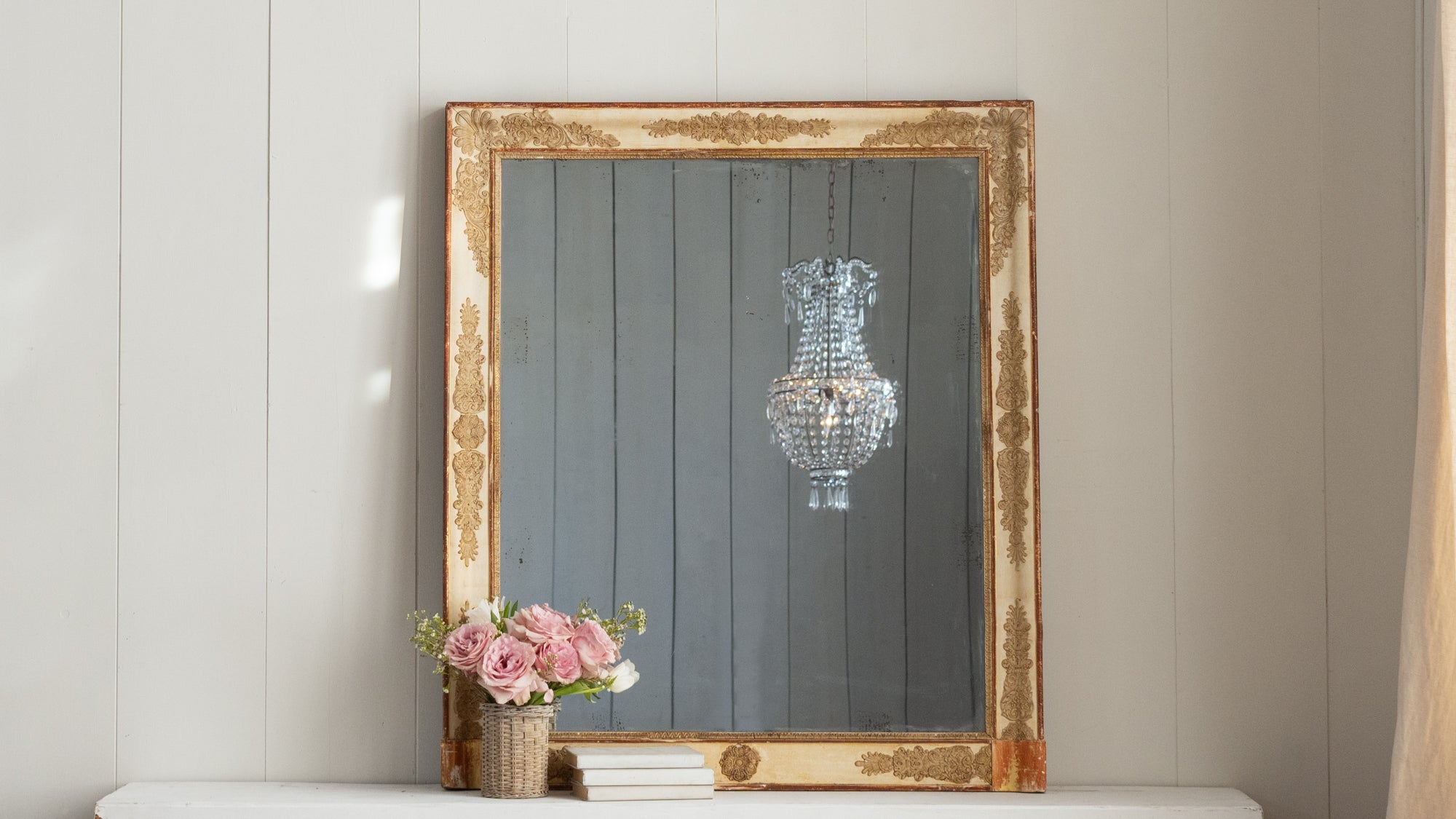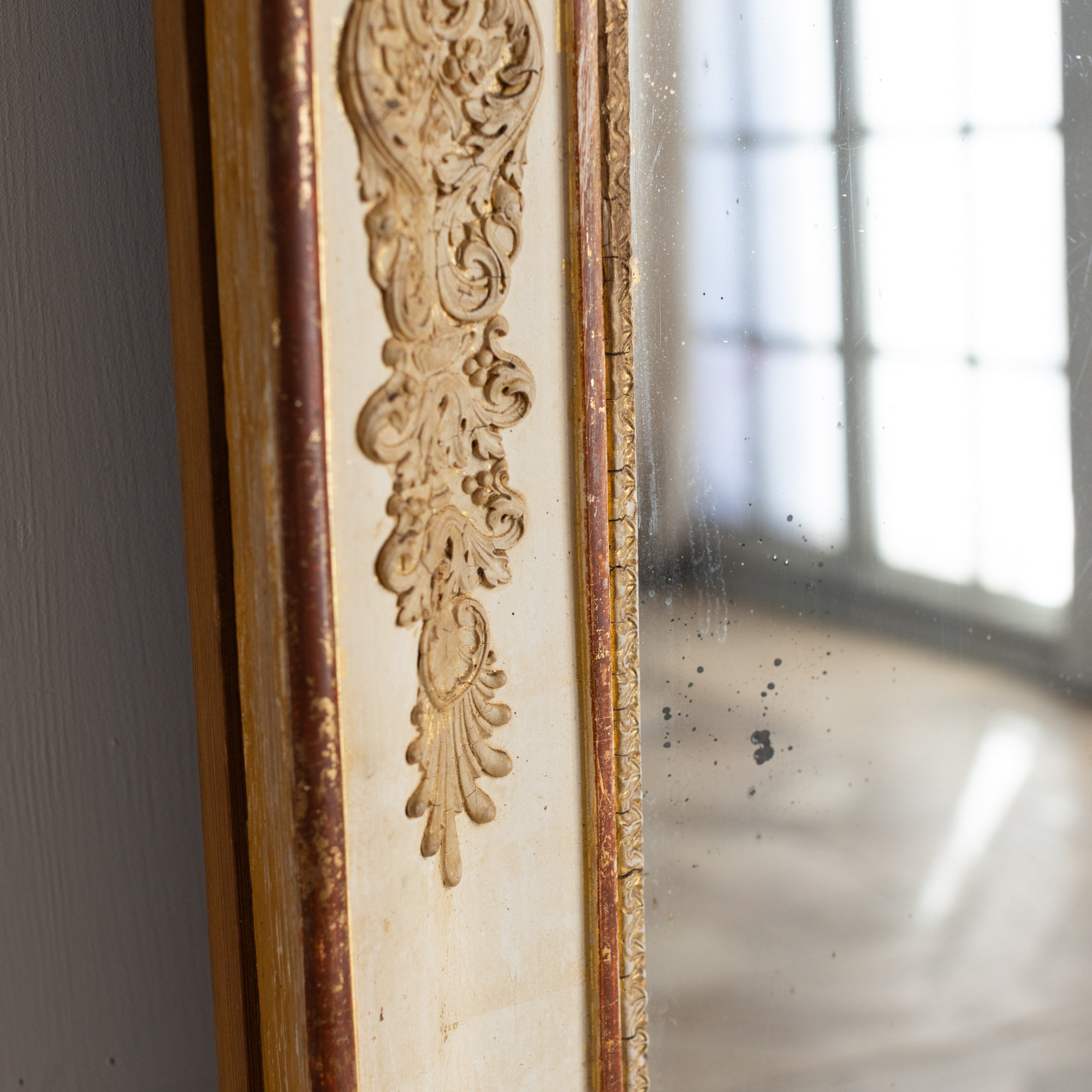 Antique mirrors have a natural patina on the mirror/frame, which is a result of time and use. These mirrors are not sold with hanging hardware. Please consult a professional to safely install your mirror in your home.