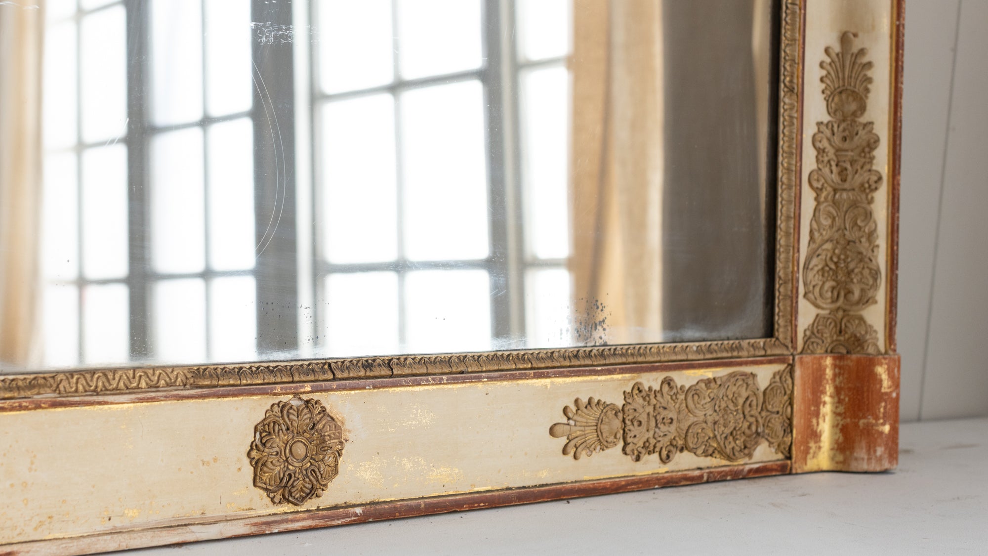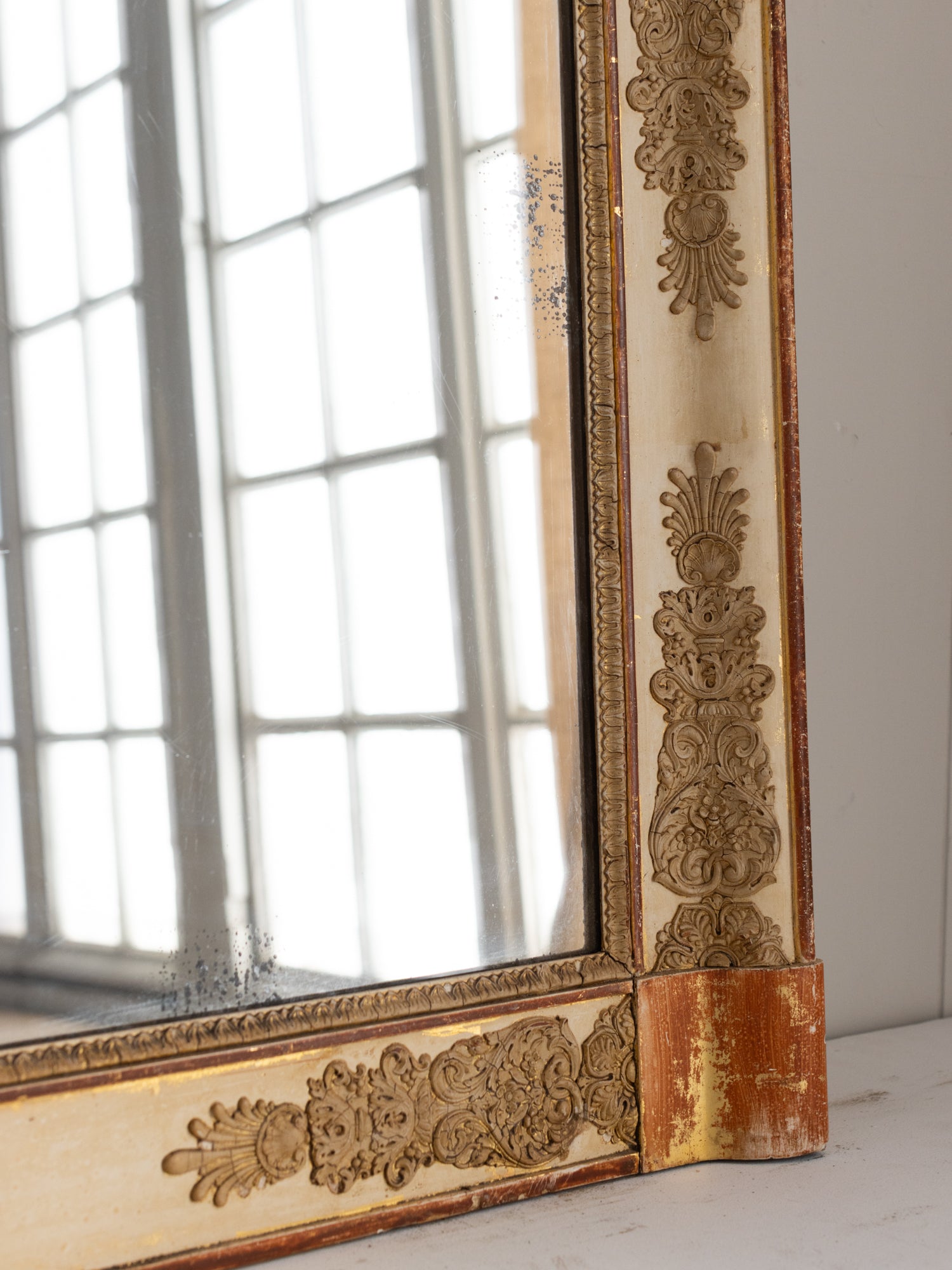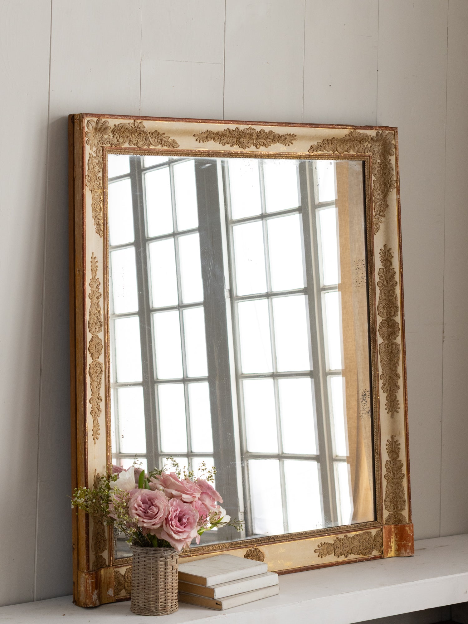 Antique mirrors have a natural patina on the mirror/frame, which is a result of time and use. These mirrors are not sold with hanging hardware. Please consult a professional to safely install your mirror in your home.