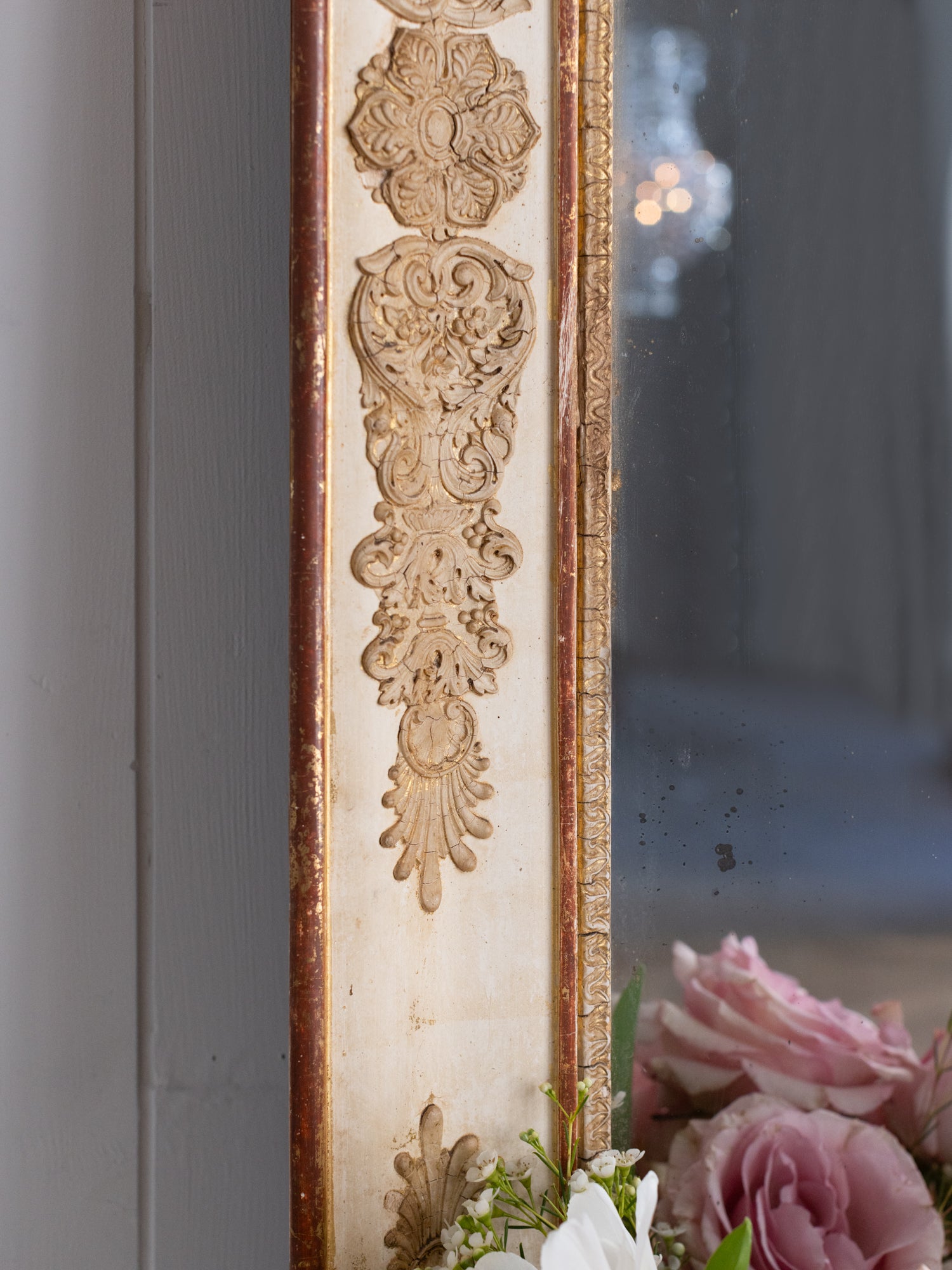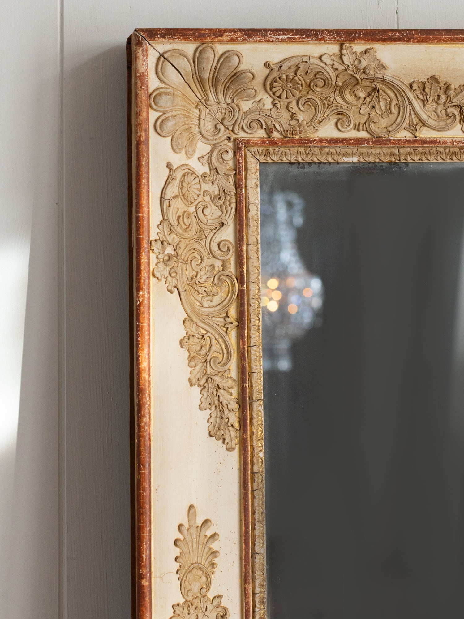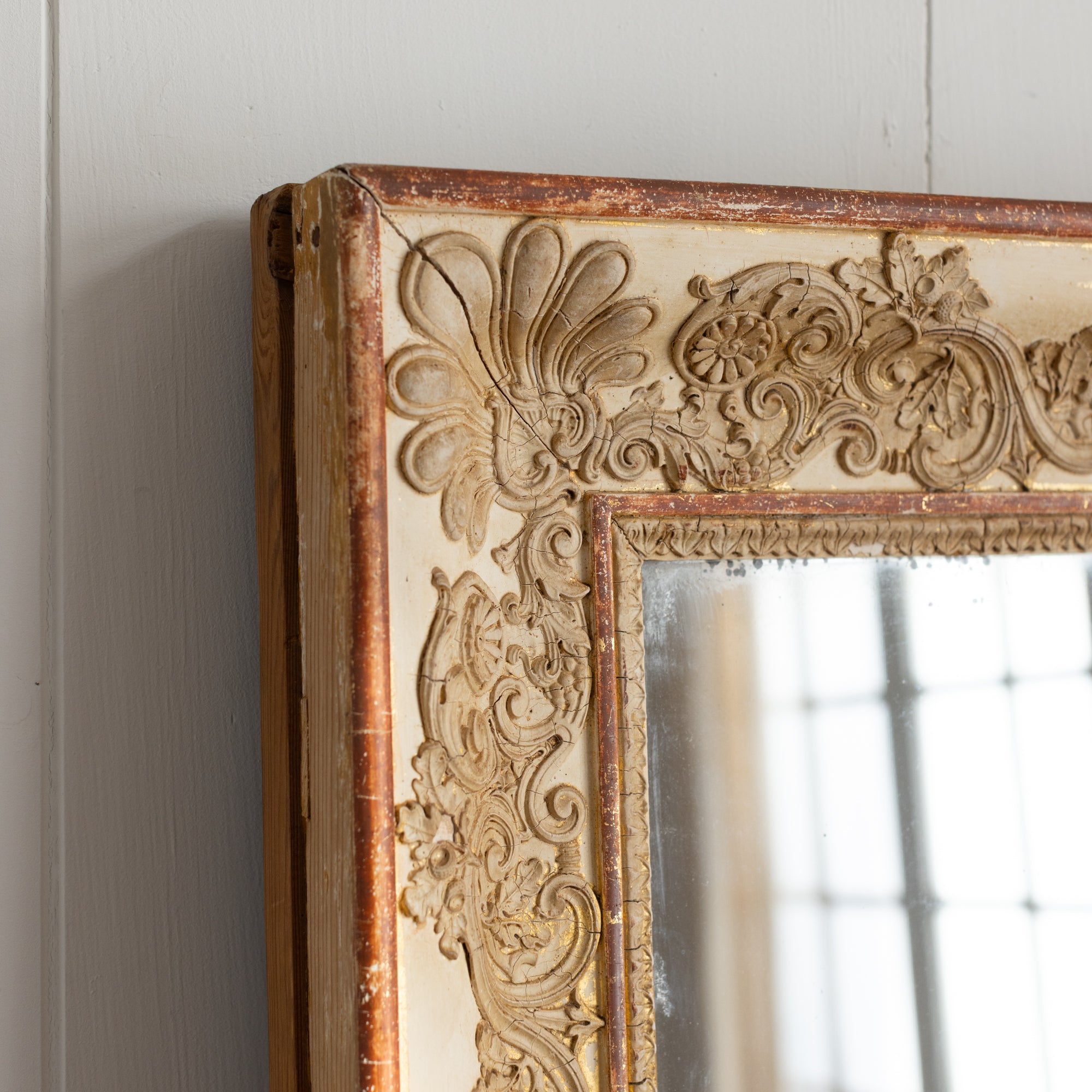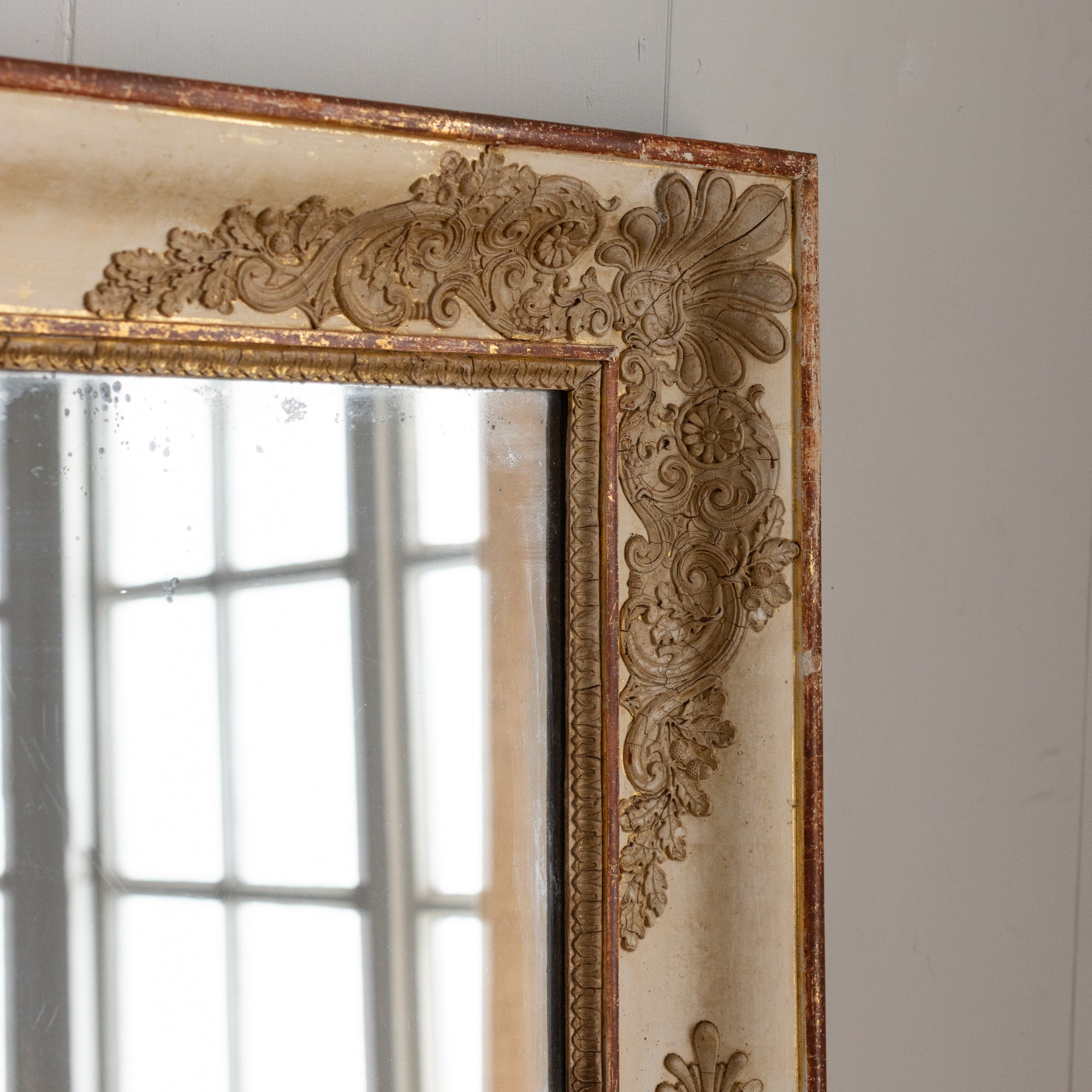 Antique mirrors have a natural patina on the mirror/frame, which is a result of time and use. These mirrors are not sold with hanging hardware. Please consult a professional to safely install your mirror in your home.