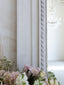Gorgeous Antique Trumeau Mirror with a fair disposition and dignified figure. It sports sensibilities uniquely tied to the 1880s, with the hand-carved flower at the crest and a turning rope and beaded frame around the mirror. Dainty floral garlands fall from the corners, elongating the piece.