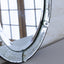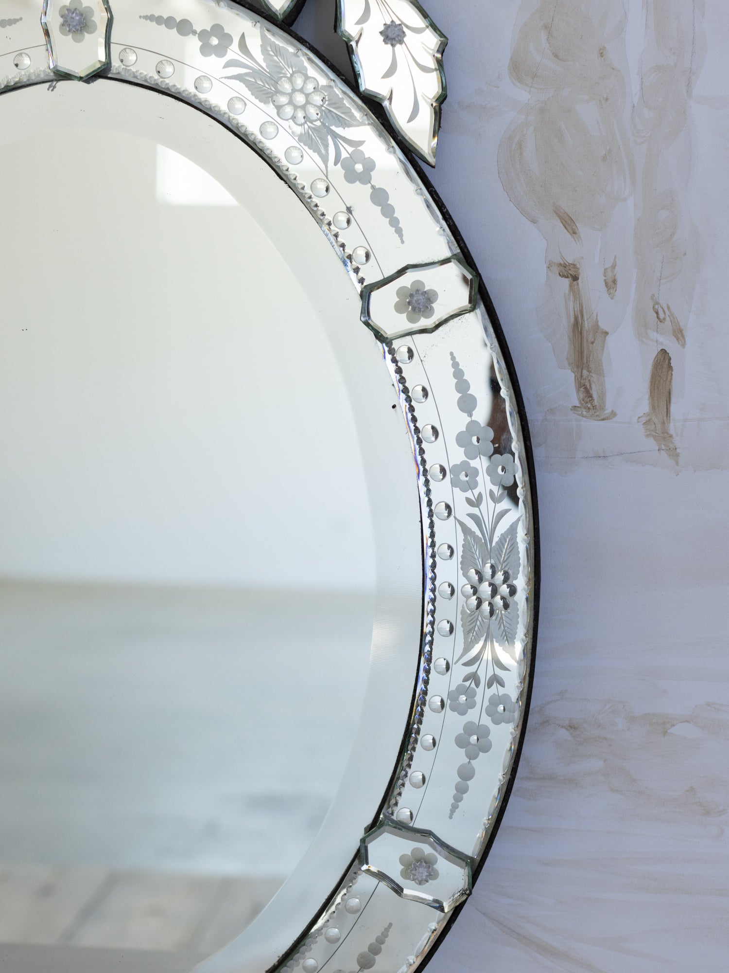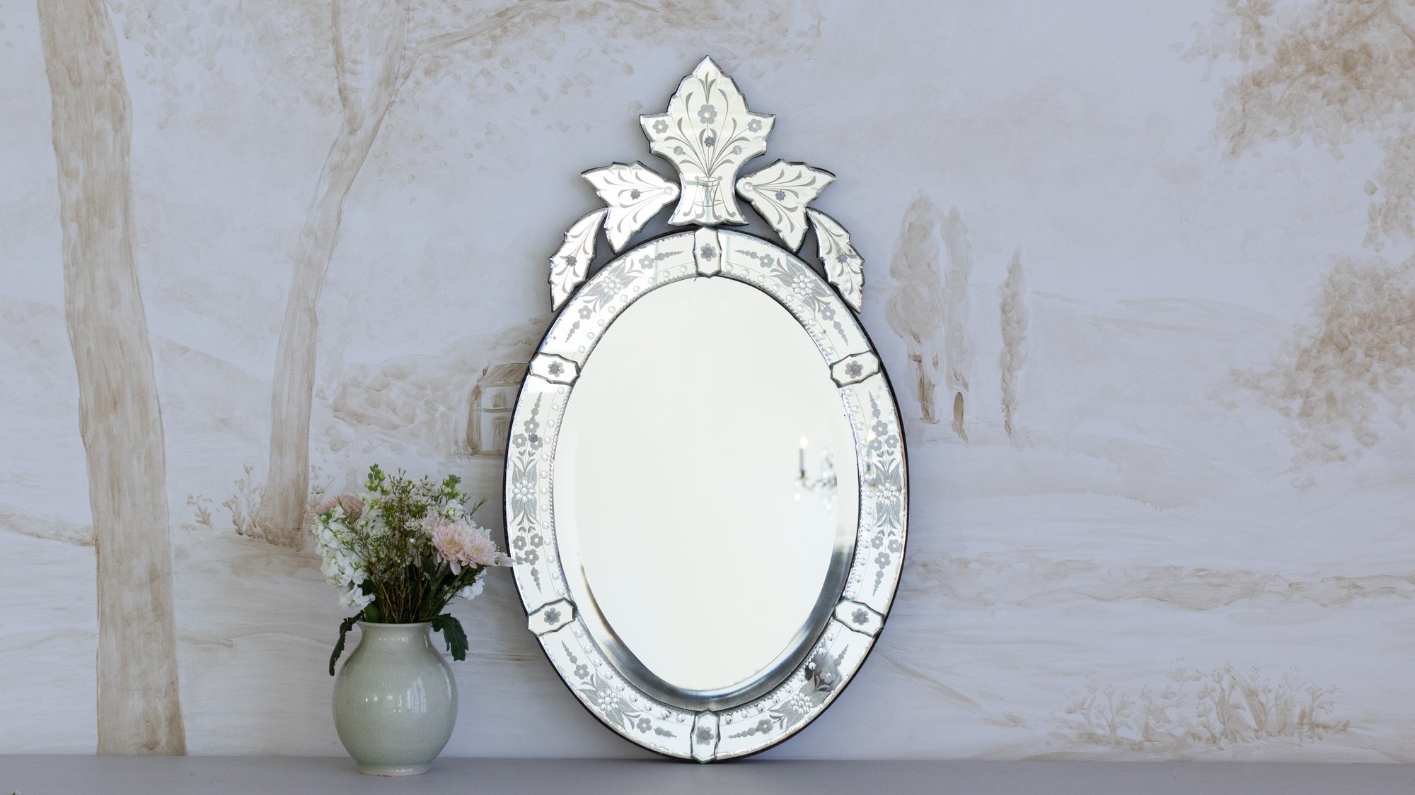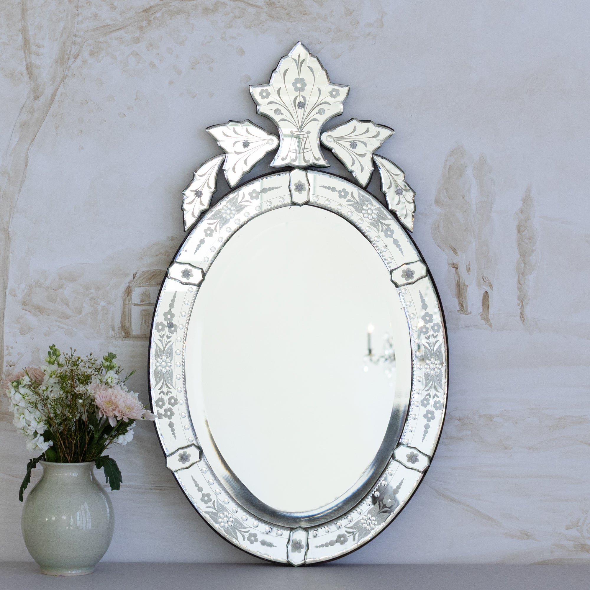 Dazzling Antique Venetian Mirror. The egg-shaped mirror features floral etching on the frame and crest, where branches sprout from a geometrical vase. Crystal flower studs hold the piece together for a beautiful touch.