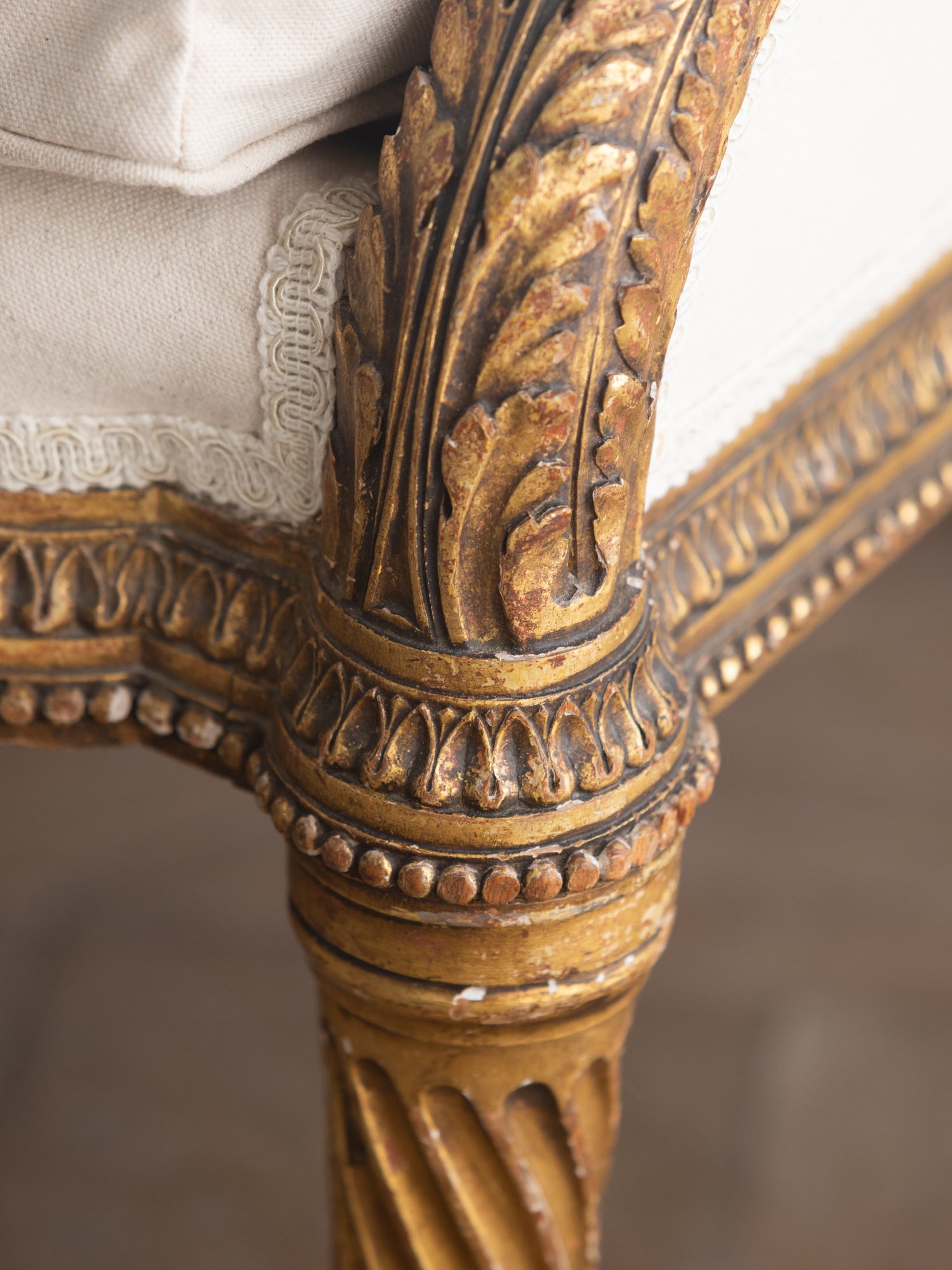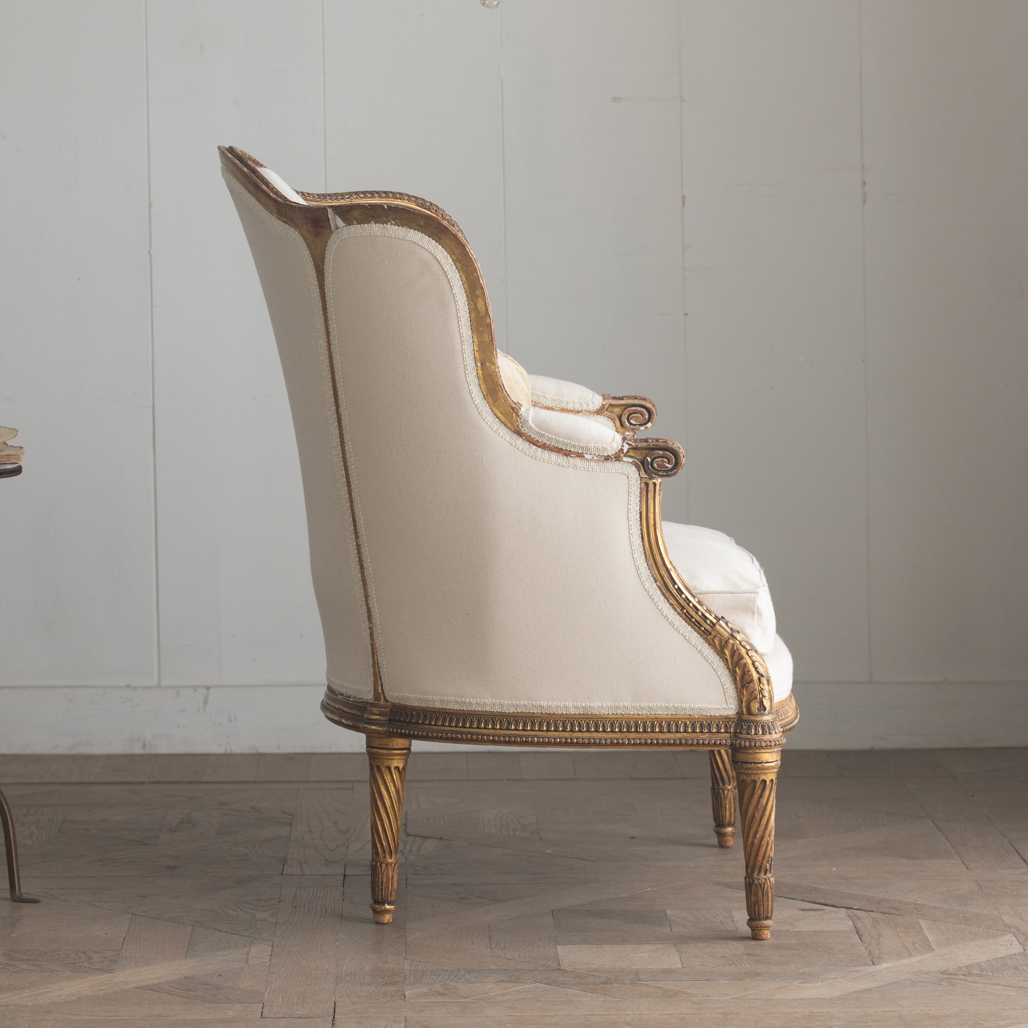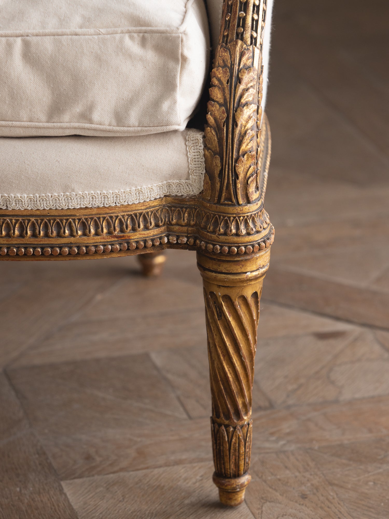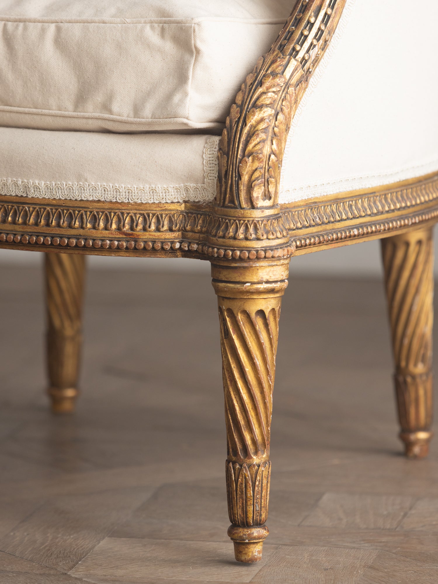 A distinctly bronze hue illuminates the classic gold gilt finish in this Antique Louis XVI Bergere. Newly upholstered with decades of history embedded in its bones. Sit and feel the craftsmanship in the scrolling leaflet of the armrests and the twisted fluted legs.