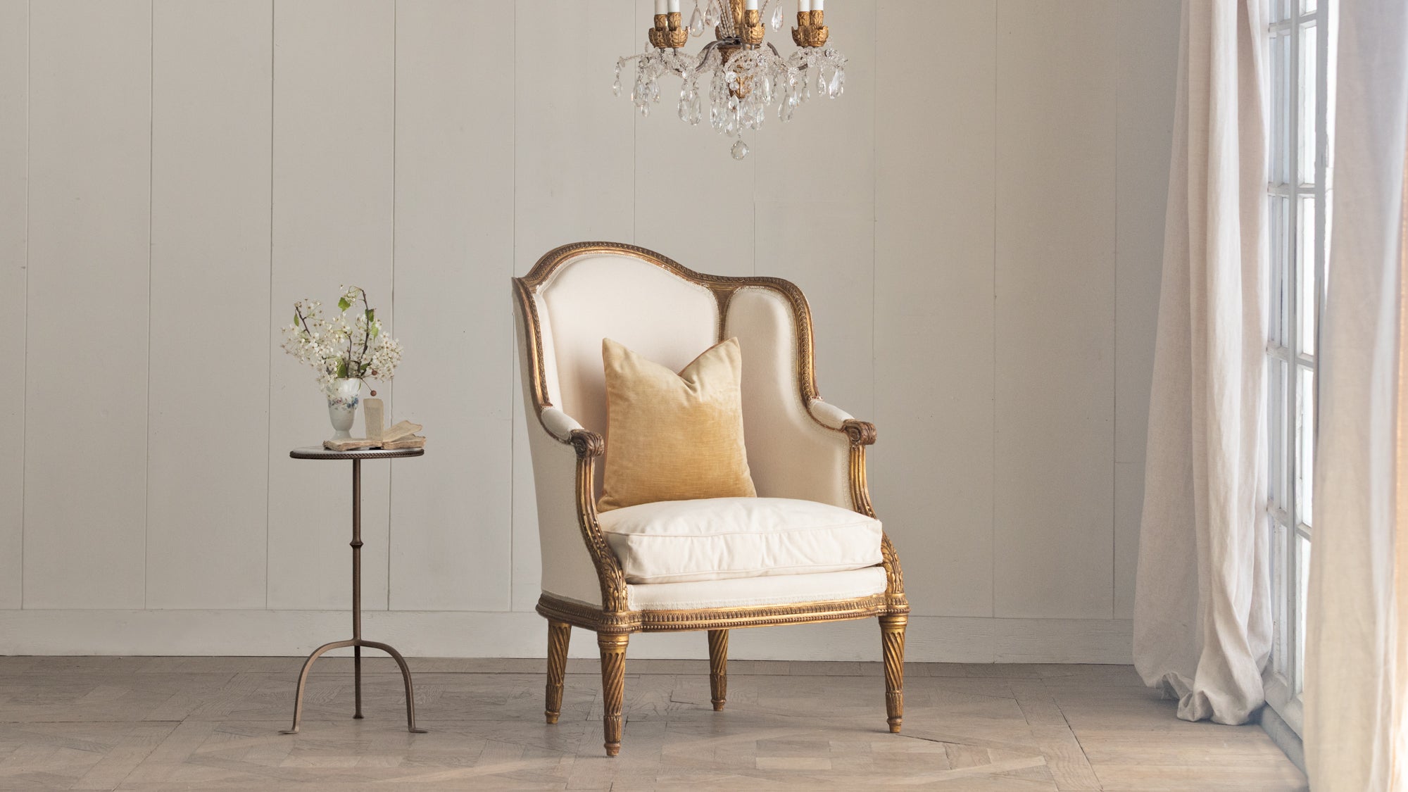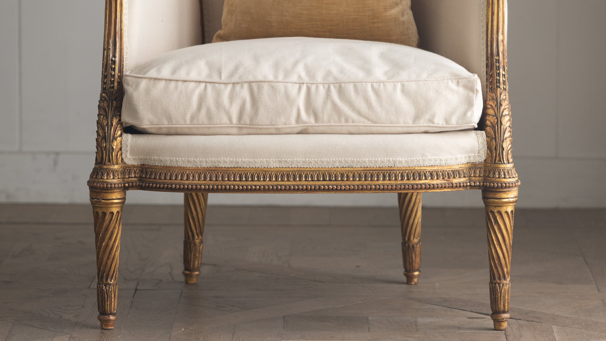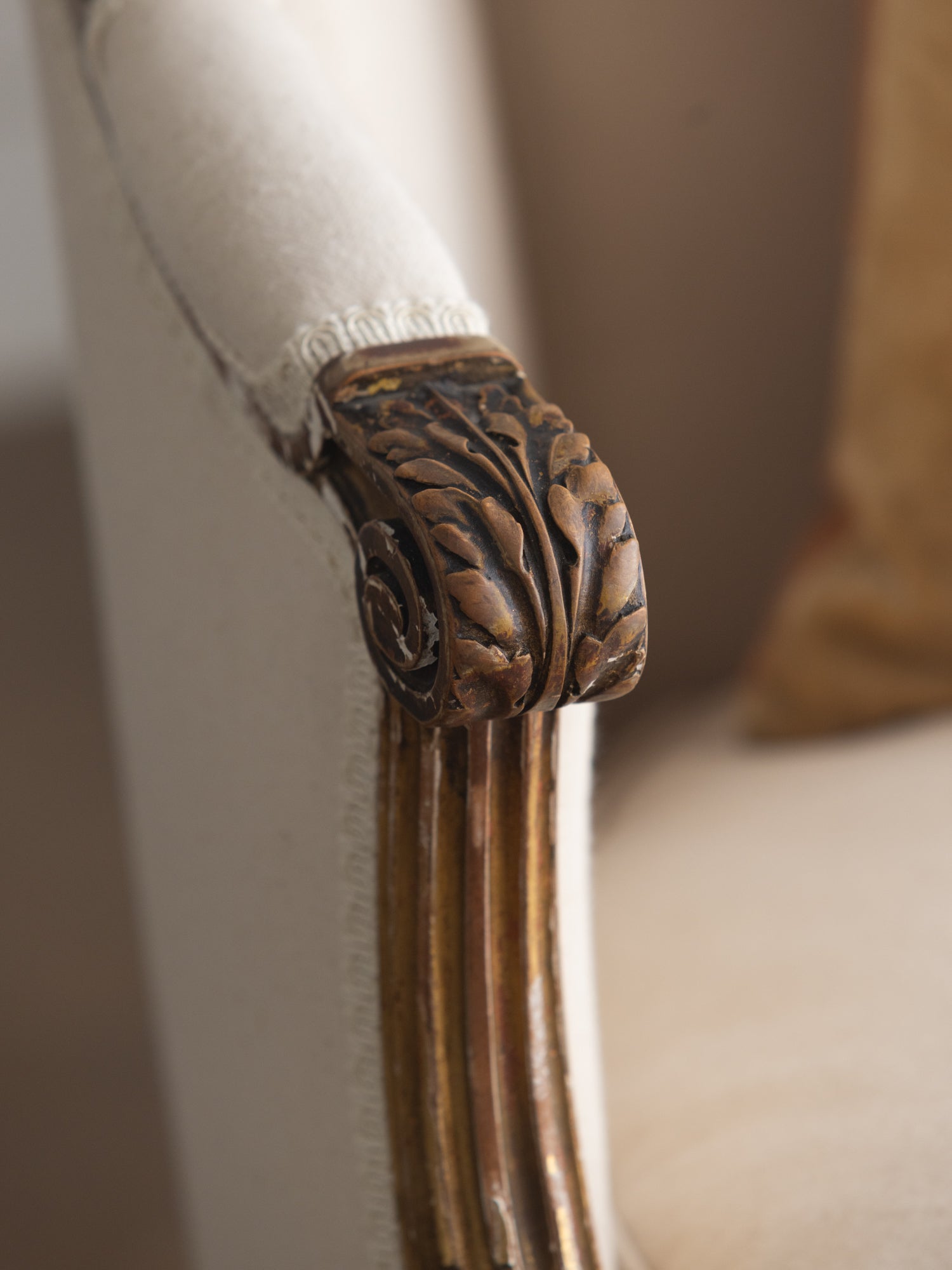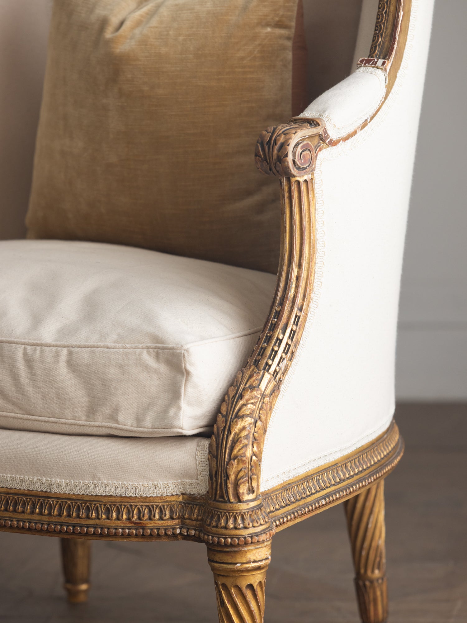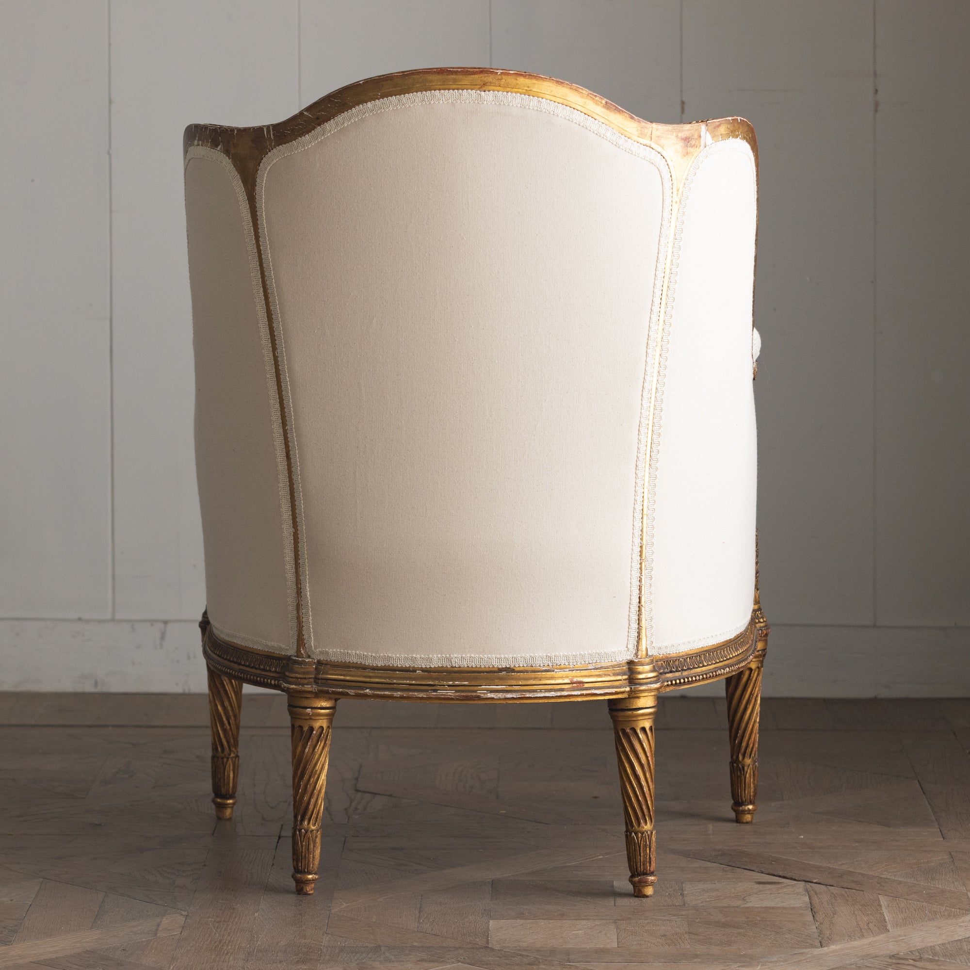 A distinctly bronze hue illuminates the classic gold gilt finish in this Antique Louis XVI Bergere. Newly upholstered with decades of history embedded in its bones. Sit and feel the craftsmanship in the scrolling leaflet of the armrests and the twisted fluted legs.