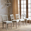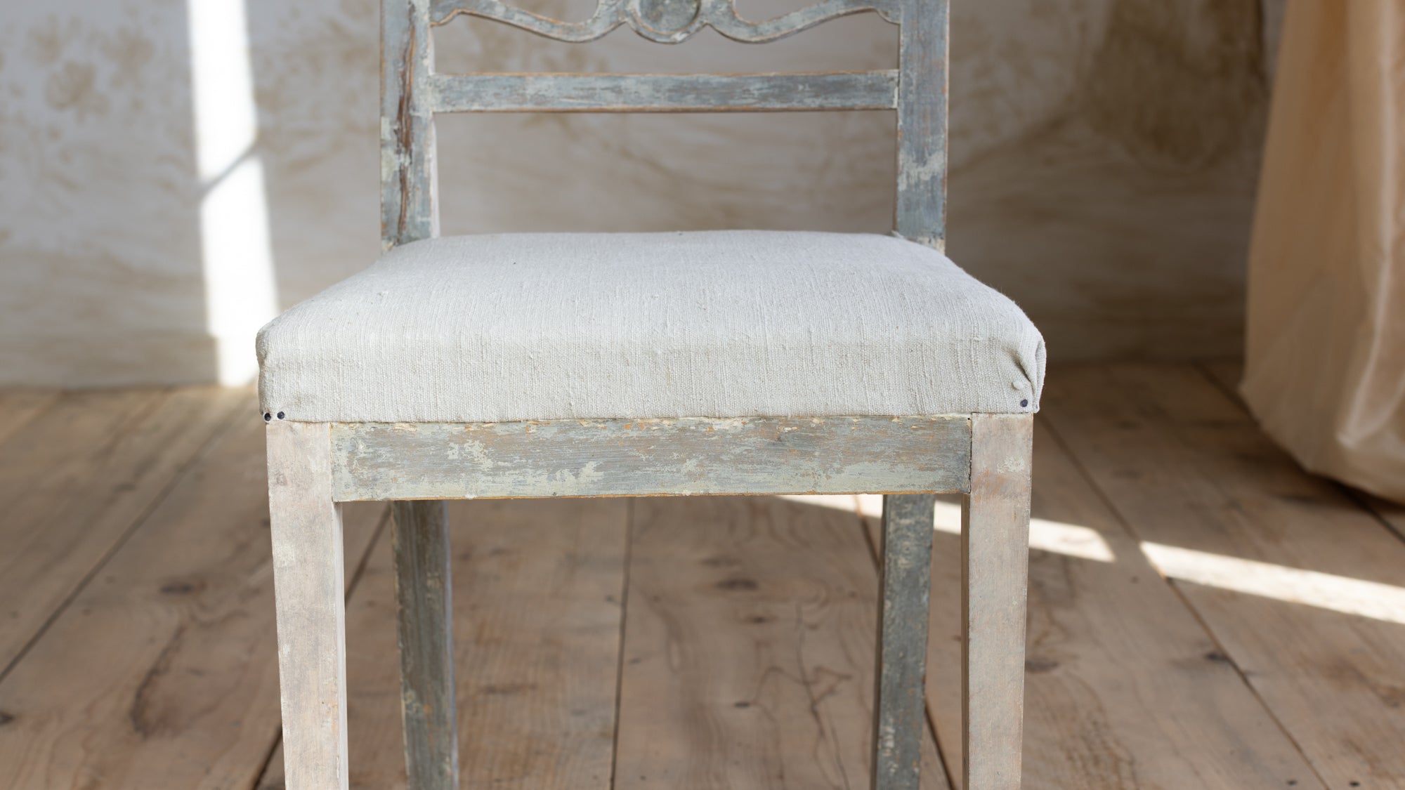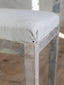 Scandinavian design heavily influences this set of Swedish Country Chairs. A pale seaglass green paints these adorably chic country chairs. Textured linen upholstery creates a wonderfully unique tactile experience and perfectly complements the softly worn texture of the wood frame.