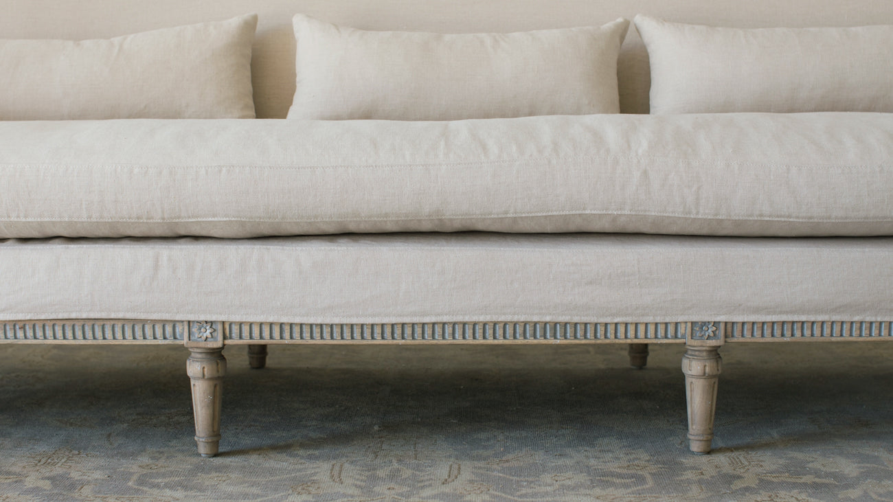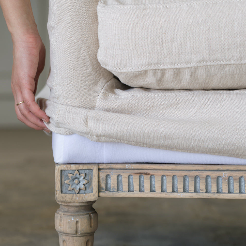Louis Cannes Sofa in Harvest Linen Slipcover and Starboard Oak Finish