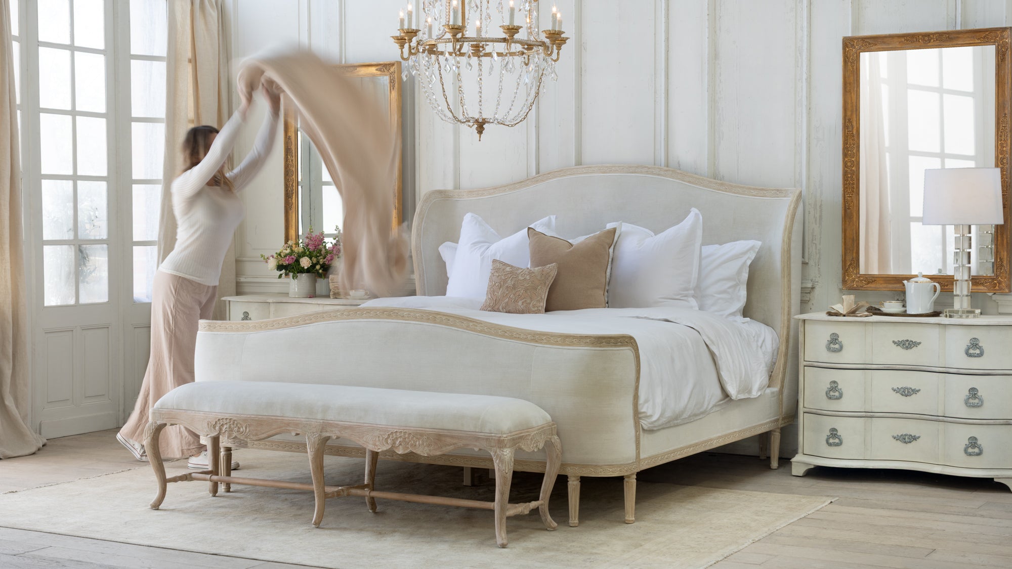The Eloquence® Helena Bed is a fresh and exclusive new design. It has a profoundly romantic and restful character with it’s enveloping and sculptural shape. The gracefully fine curves of this piece create a cocoon-like feeling of luxury. Helena is inspired by a French antique bed which we fused with the restrained influence of Scandinavian craftsmanship. Delicate hand-carved Swedish leaf carvings seamlessly blend with the refined Louis XVI French style fluted legs for a modern edited feel that will charm without over-embellishment. The Helena Bed is upholstered in a thick, luxurious, striated velvet which adds even more serene beauty and charm.