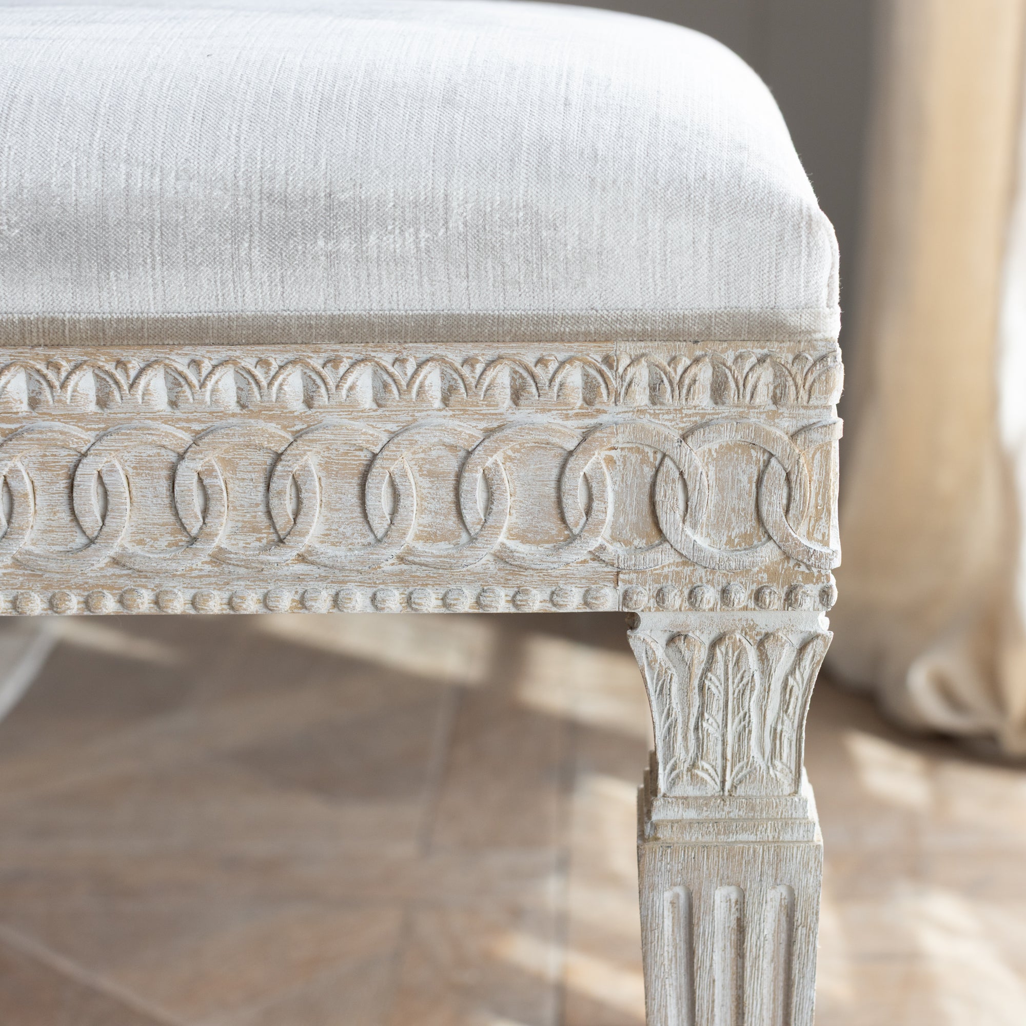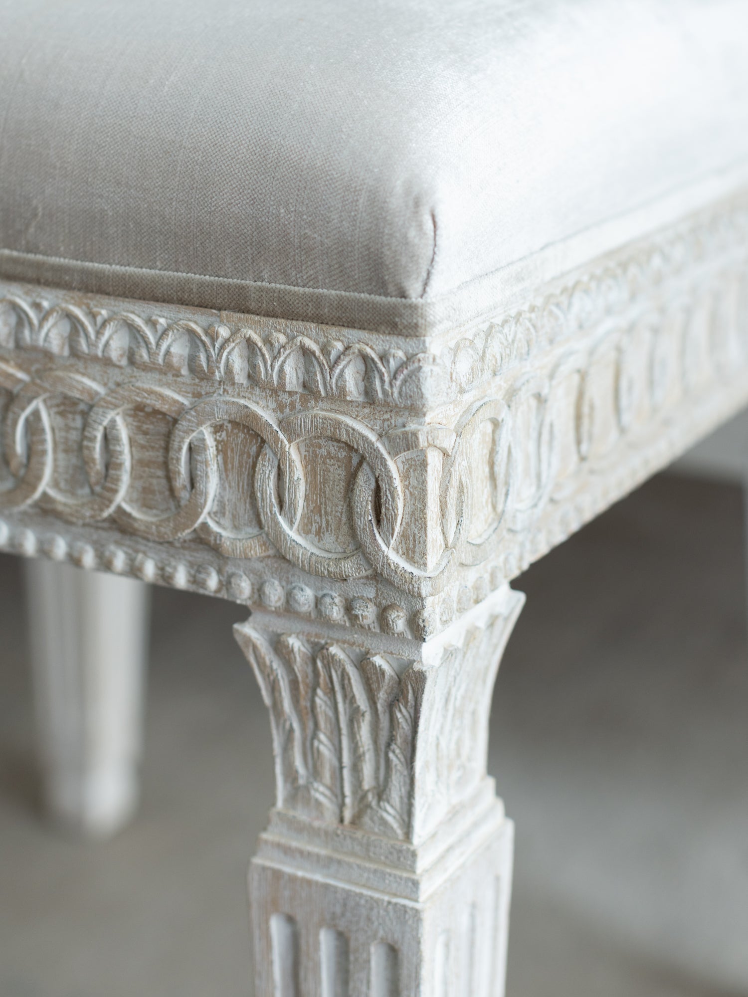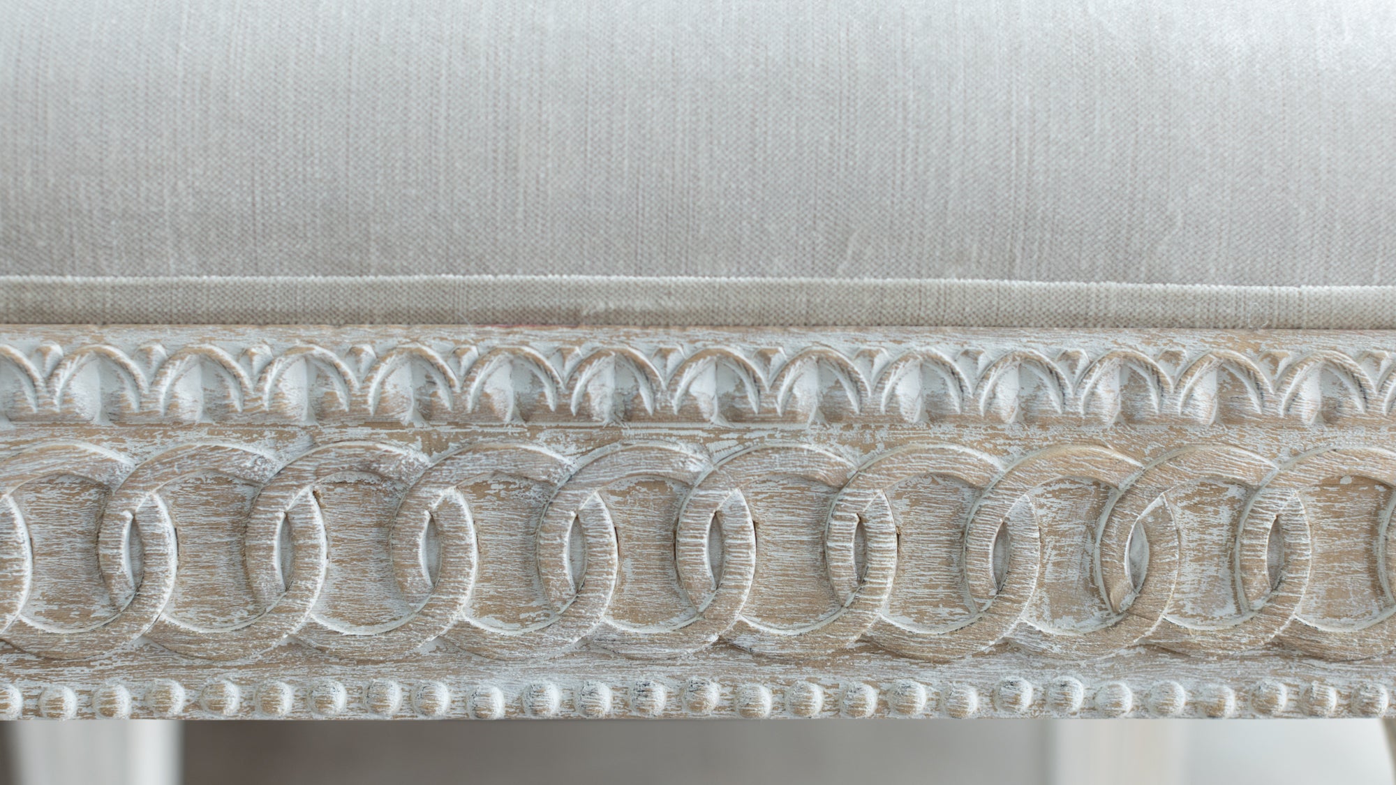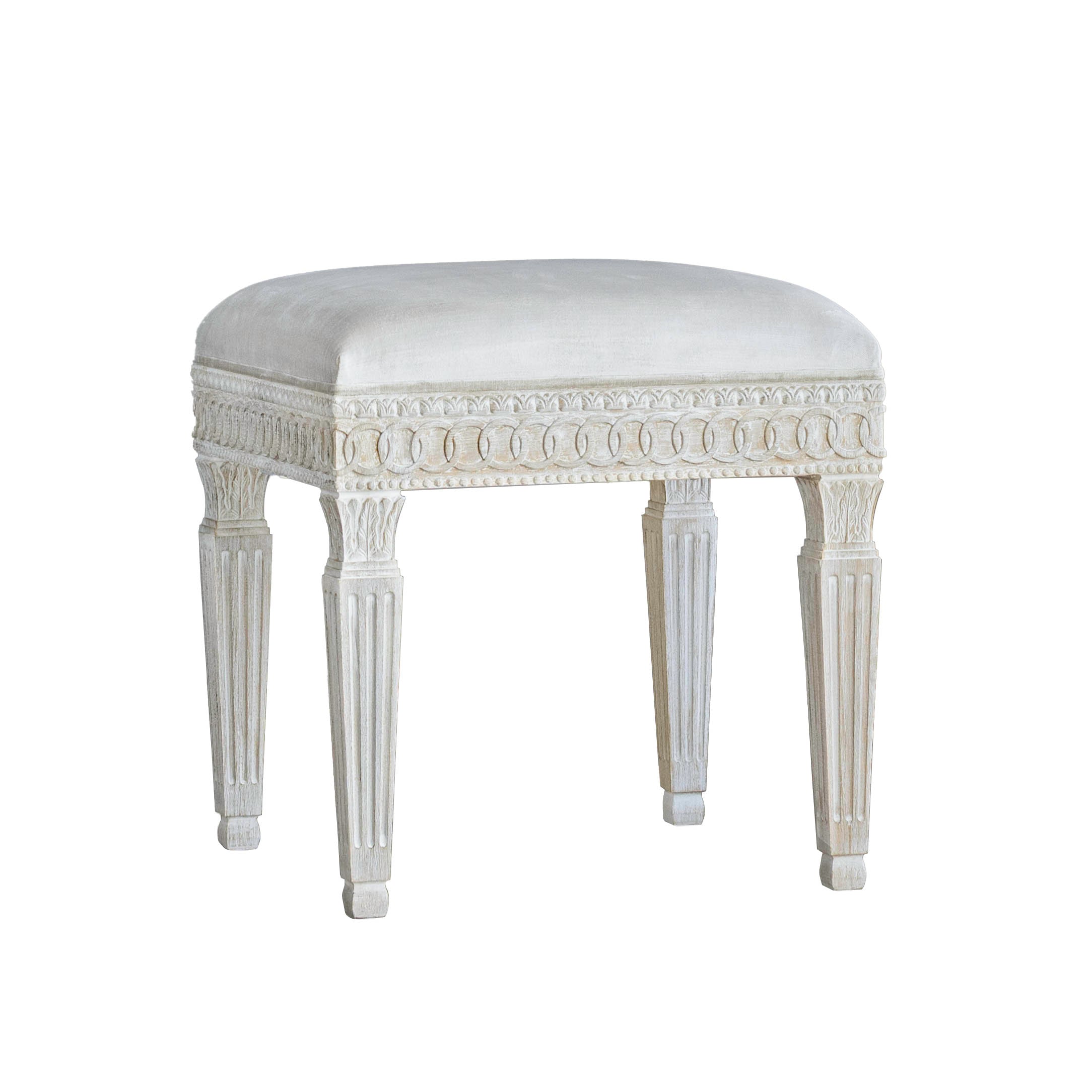 The handsome Eloquence® Adonia Stool is named after the Greek god of eternal renewal. Its clean, symmetrical frame serves as the perfect canvas for the detailed blend of neoclassical Swedish Gustavian style and Greek motif hand-carvings that adorn it. This stool features beautiful, continuous linked chain carvings and acanthus leaf details that, like Adonis, symbolize continued life. This calming and versatile stool is the perfect seating option for any room; use as a footstool or a place to rest your book and cup of tea.
