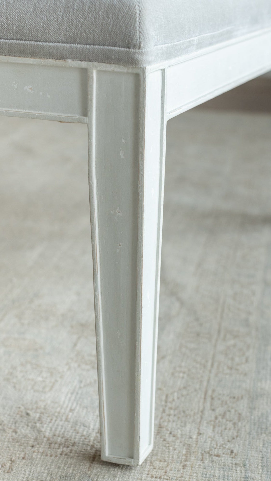 The Eloquence® Bergamin Ottoman is a graceful reinterpretation of classic Gustavian design, borrowing cues from the complimentary Bergere. Featuring a luxurious down and foam-filled cushion and square tapered legs, this piece showcases scooped panels along its wood frame. The sophisticated, hand-painted subtle green-grey finish of the frame pairs beautifully with our luxe French Eggshell Velvet. The beautiful combination of fabric and finish gives a casual, yet classic look. The Bergamin Ottoman makes a stunning statement in living spaces, bedrooms, or grand entryways. Its harmonious blend of craftsmanship and luxury ensures versatility, offering a serene and sophisticated charm to both traditional and contemporary interiors.